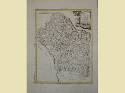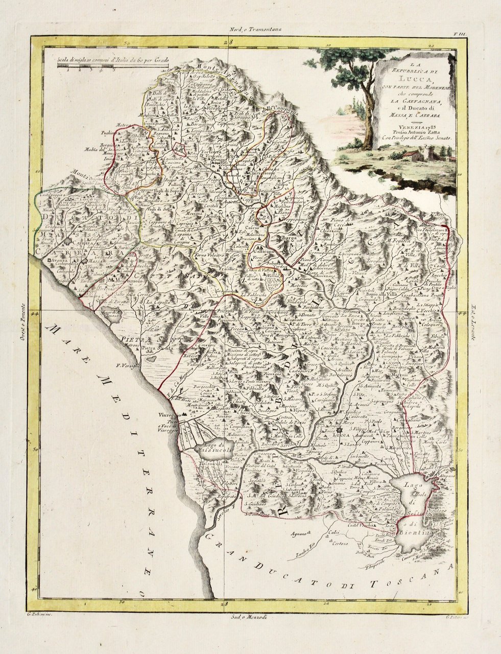 Incisione in rame, mm 305x400, colorata d'epoca ai confini. In lato a destra bel cartiglio figurato e dipinto. Antonio Zatta (1775-1797) è stato uno dei più importanti editori di carte geografiche del trardo XVIII secolo italiano. La sua opera costituisce un importante punto di passaggio tra la cartografia antica e moderna, più attenta all'accuratezza dei dettagli geografici che all'abbellimento estetico ricco di motivi mitologici o d'invenzione, come era quello dell'epoca precedente. La sua opera più importante è Atlante novissimo pubblicato tra il 1775 e il 1789. Ottimo stato di conservazione.<BR>