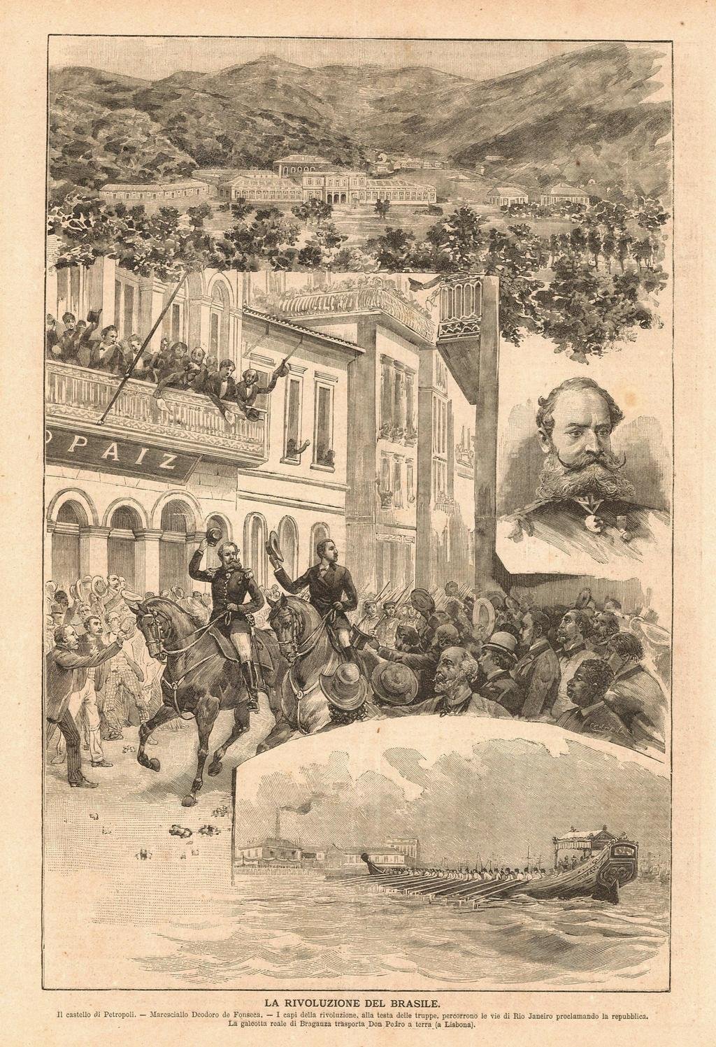 La rivoluzione del Brasile - Il castello di Petropoli - Maresciallo Deodoro de Fonseca - I capi della rivoluzione . - La galeotta reale di Braganza trasporta Don Pedro a terra (a Lisbona)