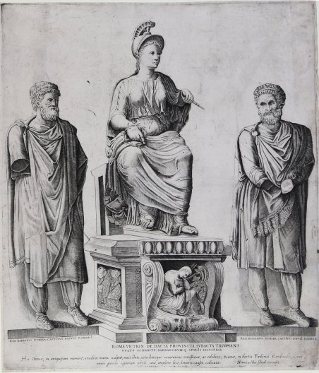 Bulino, 1549, datato in lastra in basso al centro. Esemplare nel quarto stato di cinque descritto da Alessia Alberti, con l’indirizzo dell’editore Henrich van Schoel. Bellissima prova, impressa su carta vergata coeva priva di filigrana, con sottili margini, in ottimo stato di conservazione. Iscritto in basso al centro: «ROMA VICTRIX DE DACIA PROVINCIA SVBACTA TRIVMPHANS VVLTV AC HABITV BARBARORVM Q[VE] SPOLIS INLVSTRIS» [Roma vincitrice che trionfa sulla Dacia assoggettata - notevole per il volto, l’abito e il bottino dei barbari]. Iscritto in basso a sinistra: «REX BARBARVS NVMIDA CAPTIVVS POPOVLI ROMANI» [Re Numida, prigioniero del popolo romano]. Iscritto in basso a destra: «REX BARBARVS NVMIDA CAPTIVVS POPOVLI ROMANI» [Re Numida, prigioniero del popolo romano]. Iscritto in basso: «Hæ statuæ in antiquissimo marmore, erudita manu sculptæ, maiestate, uetustatisque ueneratione conspicuæ, ac celebres; Romae, in hortis Fæderici Cardinalis Cæsij omnis generis signorum plenis, una, ampliore loco, honoris causa, collocatæ · Ant Lafreri R[omae] ? D XLVIIII» [Queste statue, in marmo antichissimo, scolpite da una mano esperta, notevoli e celebri per maestà, antichità e venerazione, a Roma, collocate tutte insieme per l’onore che meritano in un luogo più ampio, negli orti del cardinale Federico Cesi, piene di tutti i loro segni]. “Le tre statue facevano parte della collezione del cardinale Paolo Emilio Cesi (1481- 1537), appassionato raccoglitore di epigrafi e di statue antiche. Nell’incisione del Beatrizet è riprodotta al centro la statua della Dea Roma seduta in trono, e nella base il rilievo con la Germania capta. Il gruppo può datarsi al II secolo d.C. Ai lati, due statue di re barbari dello stesso periodo, provengono con molta probabilità dal Foro di Traiano. Un primo disegno delle due statue laterali, senza testa e mutilate, era stato prodotto dall’Heemskerck che lo raffigurò, lungo il muro in un angolo del giardino di casa Cesi. L’Aldovrandi nella sua opera Delle statue antiche […] edita nel 1550 così la definiva: «gran statua marmorea intiera vestita et assisa su una sedia di marmo, con una corona di lauro nella man destra e con uno stocco nella sinistra, et ha in testa un elmetto. Vogliono che ella sia una Roma trionfante. È collocata questa bella statua sopra una base antica dinanzi a la quale base è di mezzo rilievo la Dacia tutta mesta vestita» (Aldovrandi). Le statue, benché mutile, suscitarono notevole interesse tanto da indurre Clemente XI (1700-1721) ad acquistarle, come risulta dal chirografo del 4 marzo 1719, per collocarle in Campidoglio” (cfr. Marigliani, ' Lo splendore di Roma nell’Arte incisoria del Cinquecento). L’opera appartiene allo ' Speculum Romanae Magnificentiae, la prima iconografia della Roma antica. La lastra figura nell'Indice del Lafreri al n. 250, descritta come ' Roma trionfante con il re Numida prigione in casa del Cardinale Cesis. Lo ' Speculum ' ebbe origine nelle attività editoriali di Antonio Salamanca e Antonio Lafreri (Lafrery). Durante la loro carriera editoriale romana, i due editori - che hanno lavorato insieme tra il 1553 e il 1563 - hanno avviato la produzione di stampe di architettura, statuaria e vedutistica della città legate alla Roma antica e moderna. Le stampe potevano essere acquistate individualmente da turisti e collezionisti, ma venivano anche acquistate in gruppi più grandi che erano spesso legati insieme in un album. Nel 1573, Lafreri commissionò a questo scopo un frontespizio, dove compare per la prima volta il titolo Speculum Romanae Magnificentiae. Alla morte di Lafreri, due terzi delle lastre di rame esistenti andarono alla famiglia Duchetti (Claudio e Stefano), mentre un altro terzo fu distribuito tra diversi editori. Claudio Duchetti continuò l’attività editoriale, implementando le lastre dello Speculum con copie di quelle “perdute” nella divisione ereditaria, che fece incidere al milanese Amborgio Bram. Engraving, 1549, dated on lower centre plate. Example in the fourth state of five, with the address of the publisher Henrich van Schoel. Beautiful work, printed on contemporary laid paper without watermark, with thin margins, in excellent condition. The three statues were part of the collection of Cardinal Paolo Emilio Cesi (1481-1537), a passionate collector of epigraphs and ancient statues. In the Beatrizet's engraving, the statue of the goddess Roma seated on a throne is reproduced in the center, and in the base the relief with Germany captures. The group can date back to the 2nd century AD. On the sides, two statues of barbarian kings of the same period, most likely come from the Trajan's Forum. The work belongs to the Speculum Romanae Magnificentiae, the earliest iconography of ancient Rome. ' The Speculum originated in the publishing activities of Antonio Salamanca and Antonio Lafreri (Lafrery). During their Roman publishing careers, the two editors-who worked together between 1553 and 1563-started the production of prints of architecture, statuary, and city views related to ancient and modern Rome. The prints could be purchased individually by tourists and collectors, but they were also purchased in larger groups that were often bound together in an album. In 1573, Lafreri commissioned a frontispiece for this purpose, where the title Speculum Romanae Magnificentiae appears for the first time. Upon Lafreri's death, two-thirds of the existing copperplates went to the Duchetti family (Claudio and Stefano), while another third was distributed among several publishers. Claudio Duchetti continued the publishing activity, implementing the Speculum plates with copies of those "lost" in the hereditary division, which he had engraved by the Milanese Amborgio Brambilla. Upon Claudio's death (1585) the plates were sold - after a brief period of publication by the heirs, particularly in the figure of Giacomo Gherardi - to Giovanni Orlandi, who in 1614 sold his printing hou