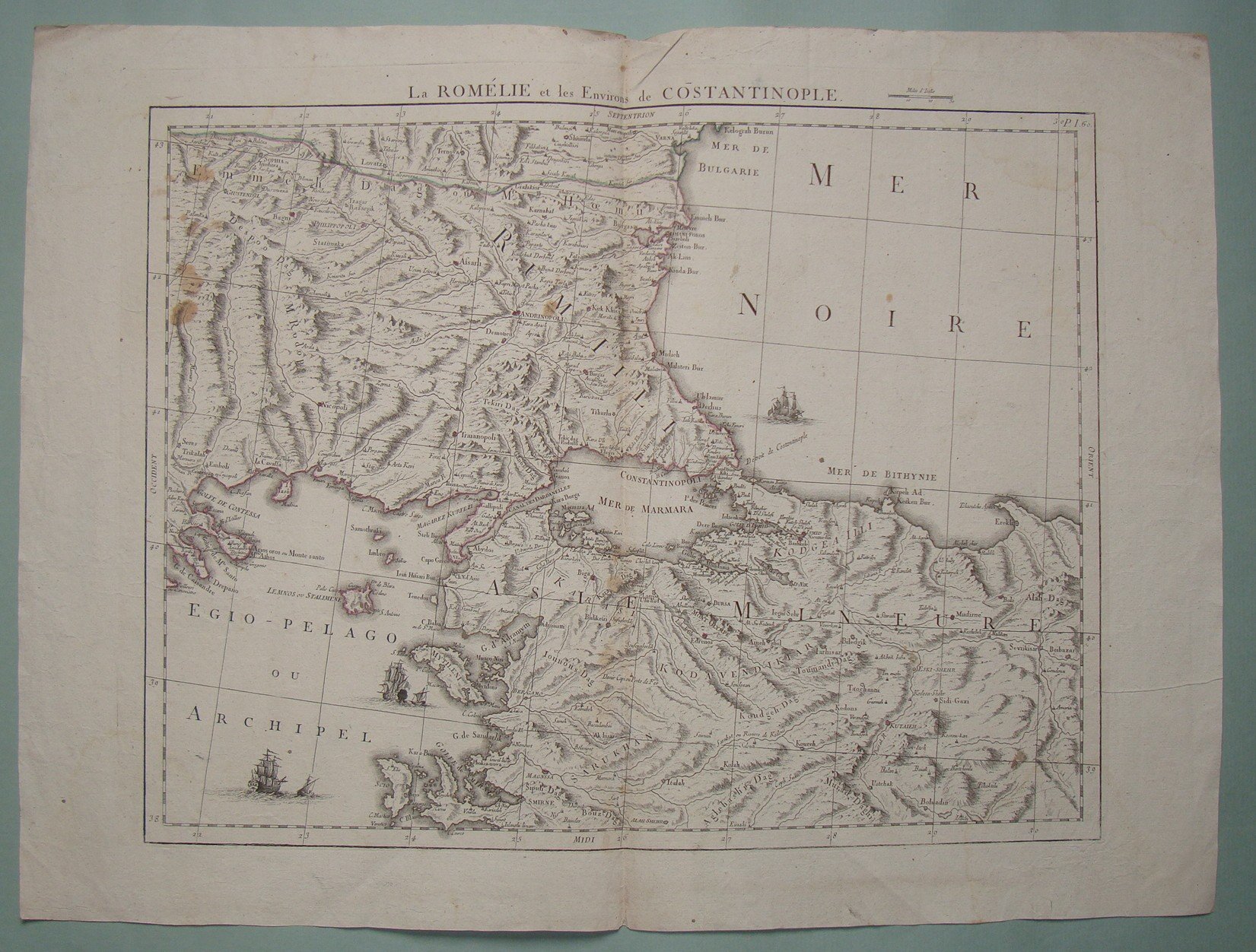La Romelie et les environs de Costantinople. 1790 ca. Double page engraved map. Light original colours in outline. Cm.41x55.