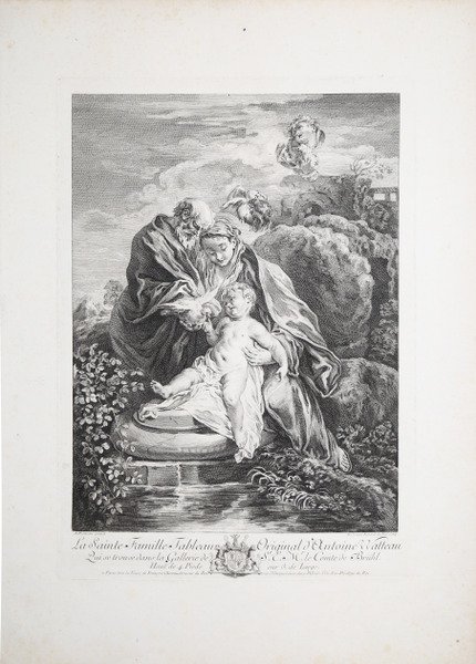 Sacra Famiglia seduta su una riva, con Giuseppe che presenta una colomba a Gesù. Da un dipinto di Antoine Watteau. Acquaforte del 1732, con nomi del disegnatore e dell'incisore, titolo, iscrizione in francese e indirizzo di pubblicazione. Firmata in basso a destra M. Jeanne Renard du Bos Sculp. Tavola 26 della celebre raccolta L'Oeuvre d'Antoine Watteau (1732). Marie-Jeanne Renard du Bos (1701 - tra il 1730 e il 1750) nacque probabilmente a Parigi e divenne allieva di Charles Dupuis. Incise diversi dipinti, tra cui un quadro di Francoise Basseporte raffigurante una donna a mezzo busto che accarezza un coniglio, che fu pubblicato in Versailles immortalisée nel 1720. Per questo fu citata nel dizionario delle donne famose di Louis-Marie Prudhomme. Nel 1830 Prudhomme affermò che l'anno della sua morte era sconosciuto. Probabilmente morì a Parigi. Bella impressione, stampata su carta vergata coeva, con margini, in ottime condizioni. Bibliografia Dacier & Vuaflart, Jean de Jullienne et les graveurs de Watteau au XVIIIe siècle (26.II). Holy Family sitting on a shore, with Joseph presenting a dove to Jesus. After Antoine Watteau. Etching, 1732, lettered with names of designer and engraver, title, inscription in French, and publication line. Signed at lower right M. Jeanne Renard du Bos Sculp. Plate 26 from 'L'Oeuvre d'Antoine Watteau'. Marie-Jeanne Renard du Bos (1701 – between 1730 and 1750) was a French engraver. She was probably born in Paris and became a pupil of Charles Dupuis. She engraved several paintings, including a painting by Francoise Basseporte of a woman at half-length stroking a rabbit, that was published in Versailles immortalisée in 1720. She was mentioned for this in Louis-Marie Prudhomme's dictionary of famous women. Prudhomme claimed the year of her death was unknown in 1830. She probably died in Paris. A fine impression, printed on contemporary laid paper, with margins, very good condition. Bibliografia Dacier & Vuaflart, Jean de Jullienne et les graveurs de Watteau au XVIIIe siècle (26.II). Cfr.
