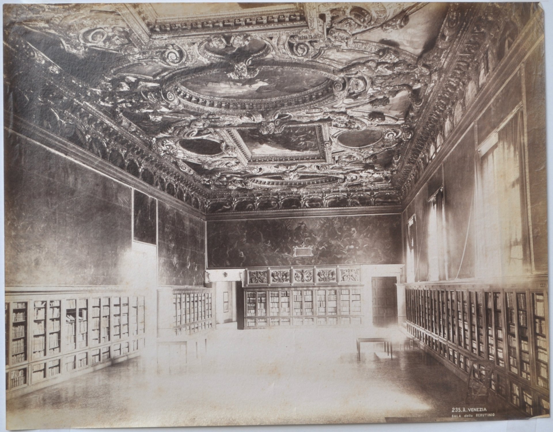 Fotografia originale da gelatina ai sali d'argento su carta baritata di mm 345 x 270. A china, in bianco, come spesso nelle fotografie di Naya, la dicitura : "235.A Venezia Sala dello Scrutinio". Carlo Naya (1816-1882) fu uno dei più importanti fotografi italiani del diciannovesimo secolo; piemontese di nascita, di famiglia agiata, si trasferisce a Venezia nel 1857, associandosi con il già celebre fotografo Carlo Ponti, da cui si separerà nel 1868, aprendo due laboratori autonomi.