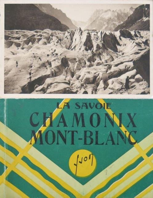 Edition D'Art Yvon, Paris, 1930 circa. Album di 09 cartoline postali firmate Yvon, cm 9 x 15 (l'album), cm 9 x 14 (le cartoline). L'album è mancante di alcune ma di quelle presenti sette riguardano monti e ghiacciai, tra cui “La Traversée de la Mer de Glace au Montenvers”, “La Mer de Glace et le massif des grandes Jorasses” “La grotte du Glacier des Bossons”, “Les Sèracs de la mer de Glace”; una il centro del paese animato da figure cittadine e automobili; una, con villeggianti e sdraio, “La plage et aiguille du Drû”. Conservata la brossura originale in carta ill. con disegni geometrici in colore, tutte le cartoline sono in buono stato di conservazione.
