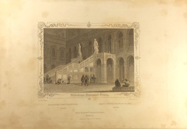 Incisione in acciaio, foglio 23 x 16 cm, 19 x 14 cm alla battuta. Veduta del Canal Grande con la Ca' Foscari. Dentro cornice incisa. In basso al centro"Riesentreppe Dogenpalast. Venedig". Ai lati in piccolo: "Gez. von J. Poppel" a sinistra, "Gest. von J. Poppel" a destra.Gez. von J. Poppel. Gest. von J. Poppel.". Più in basso il titolo ripetuto in francese, inglese e italiano. Ancora più in basso in centro: "Verlag von J Poppel u. M. Kurz Munchen". Proveniente da: "Venedig: 24 Ansichten nach der Natur gezeichnet, gestochen und herausgegeben von J. Poppel und M. Kurz; mit geschichtlichem und beschreibendem Text von Rudolph Loser."Johann Gabriel Friedrich Poppel (1807-1882): editore, pittore, incisore calcografico e incisore d'acciaio tedesco.
