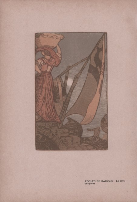 Xilografia a due legni, 1908, priva di firma. Impressione eccellente su carta avorio liscia. Ottimo stato di conservazione. Ampi margini oltre la linea marginale. Nel primo decennio del 1900, De Carolis dedica molta attenzione alla rievocazione di temi popolari, legati in particolare alle raffigurazioni di marine, così come testimonia questa stampa. L'utilizzo di più colori e quindi di un numero maggiore di legni ben si adatta alla vivacità di questi soggetti. Dopo l'adesione nel '96 al gruppo romano ' In arte libertas, ' creato dal paesista Nino Costa, dal 1901 insegna ornato in accademia nella Firenze dei maestri del Rinascimento, del "terribile" Michelangelo, del Böcklin dell'Isola dei morti. Comincia ad ornare libri per D'Annunzio e Pascoli e dal 1903 elabora fregi e d articoli per la rivista "Leonardo" fondata con Papini e Prezzolini. Fra le rigogliose figurazioni per la Francesca da Rimini (1902), le rusticane de La figlia di Iorio (1904), le lapidarie del Notturno del "Vate" (1917-21), le stampe marinaresche esprimono un'autonoma poetica. Il varo, L'argano, Il timone, La foce, Le arche - xilografie eseguite fra il 1904 e il 1908, mentre in Europa esplodono primi fenomeni d'avanguardia - denotano un lirismo contemplativo invischiato nel ristagno simbolista che connota la situazione italiana all'avvio del secolo. Ma al di là dei convenzionali significati latenti, quelli manifesti aprono - pur aderendo al fervore estetico del giapponismo fin-de-siècle - un discorso etnografico che si fa via via più urgente, teso a documentare l'irripetibile patrimonio che la "novella civiltà livellatrice" viene annientando. L'appello del 1920 (L'arte popolare, in "La Fionda", Roma) riscuote entusiastiche risposte, stimolando una sensibilità che nel 1923 porta all'istituzione del Regio Museo di etnografia italiana, dal 1956 Museo Nazionale delle Arti e Tradizioni popolari. Woodcut printed from two blocks. Excellent impression, printed on ivory paper, wide margins, good condition. De Carolis was an artistic polymath, working as a painter (in particular of murals), interior designer, decorator, xylographer (wood engraver), illustrator and photographer, and is probably the best known exponent of Art Nouveau in Italy. His talent and originality was quickly recognised by two of the greatest Italian writers and poets of the day, Gabriele D'Annunzio and Giovanni Pascoli, and he became their preferred illustrator. Among his most popular works were many illustrations for ' Gabriele d'Annunzio's novels (Il Notturno, ' La figlia di Jorio) and ' Giovanni Pascoli‘s books of poems. In the first decade of the 1900s, De Carolis devoted a great deal of attention to the evocation of popular themes, linked in particular to representations of seascapes, as this print testifies. The use of more colors and therefore a greater number of woods is well suited to the liveliness of these subjects. After joining in '96 the Roman group In arte libertas, created by the landscape painter Nino Costa, from 1901 he taught ornament in the academy in Florence of the Renaissance masters, of the "terrible" Michelangelo, of Böcklin of the Isle of the Dead. He began to decorate books for D'Annunzio and Pascoli and since 1903 elaborates friezes and articles for the magazine "Leonardo" founded with Papini and Prezzolini. ' Among the luxuriant figurations for the Francesca da Rimini (1902), the rusticane of The daughter of Iorio (1904), the lapidarie of the Nocturne of the "Vate" (1917-21), the prints marinaresche express an autonomous poetic. Il varo, L'argano, Il timone, La foce, Le arche - woodcuts made between 1904 and 1908, while the first avant-garde phenomena were exploding in Europe - denote a contemplative lyricism caught up in the symbolist stagnation that characterized the Italian situation at the beginning of the century. But beyond the conventional latent meanings, the manifest ones open - while adhering to the aesthetic fervor of Japanism fin-de-siècle - an ethnographic discourse that becomes more and more urgent, aimed at documenting the unique heritage that the "new leveling civilization" is annihilating. The appeal of 1920 (L'arte popolare, in "La Fionda", Rome) received an enthusiastic response, stimulating a sensitivity that in 1923 led to the establishment of the Royal Museum of Italian Ethnography, since 1956 the National Museum of Popular Arts and Traditions. Cfr.