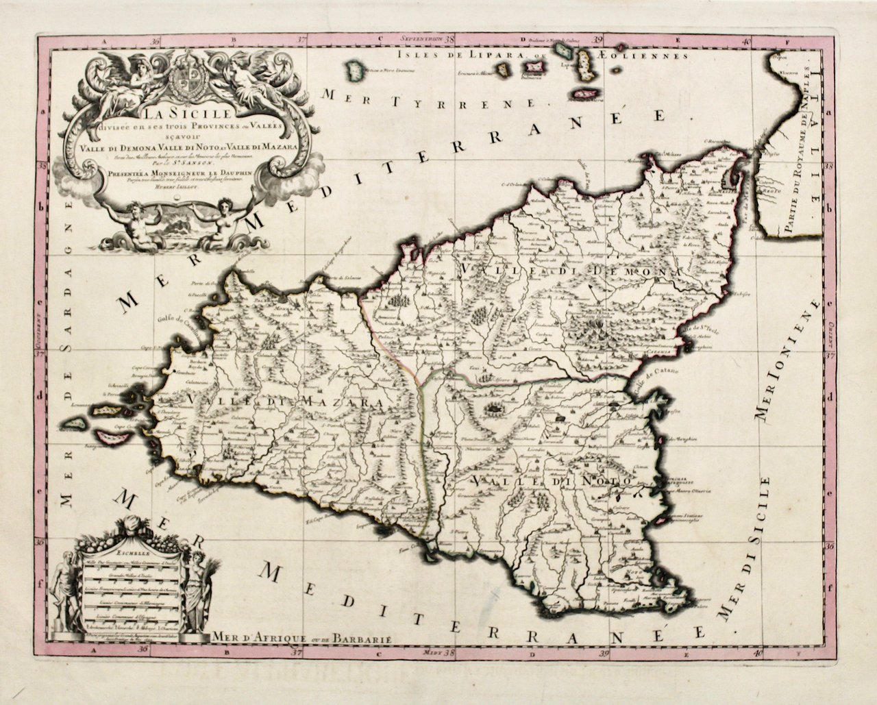 La Sicile divisée en ses trois provinces ou valées scavoir Valle di Demona, Valle di Noto et Valle di Mazara.