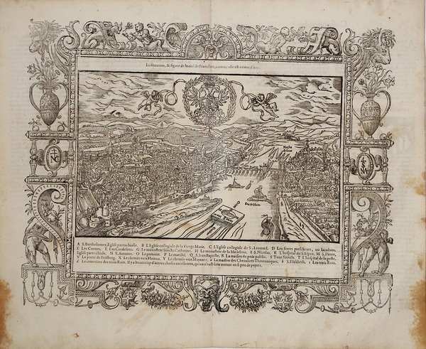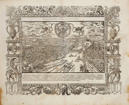 Veduta tratta dalla celebre ' La Cosmographie Universelle de tout le Monde ' (Parigi, 1575) di Francois de Belleforest, traduzione francese della ' Cosmographia ' di Sebastian Muenster. A differenza del Muenster, questa opera è pubblicata in una sola edizione, e risulta pertanto molto rara. Le tavole xilografiche incluse nell’opera sono derivazioni da Abraham Ortelius, Braun & Hogenberg oltre che da Muenster. Alcuni legni sono invece ripresi utilizzando le matrici pubblicate per la prima volta nel 1552 nella ' Cosmografia ' di Lione da Guèroult & Balthazar Arnoullet (1517-1556), nel ' Premier livre des figure set pourtraitz des villes plus illustre set renommées d’Europe, contenente 9 immagini urbane, perlopiù copiate dalla ' Cosmographia ' di Sebastian Muenster. L'opera fu pubblicata in due volumi. Solo 49 delle 163 incisioni che compaiono nei due volumi sono tratti dalla ' Cosmographia ' del Munster. Gli editori Chesneau e Sonnius fecero uso anche di materiale da poco apparso sul mercato librario. Xilografia, in ottimo stato di conservazione. Bibliografia M. Pastoureau, ' LES ATLAS FRANÇAIS XVIe-XVIIe siècles. Répertoire bibliographique et étude. - Belleforest I-1 [2]. View taken from the famous ' La Cosmographie Universelle de tout le Monde ' (Paris, 1575) by Francois de Belleforest, a French translation of Sebastian Muenster's ' Cosmographia. Unlike the Muenster, this work is published in only one edition, and is therefore very rare. The woodcut plates included in the work are derivations from Abraham Ortelius, Braun & Hogenberg as well as Muenster. Some woodcuts, however, are taken using the plates first published in 1552 in the ' Cosmographia ' de Lyon by Guèroult & Balthazar Arnoullet (1517-1556), in the ' Premier livre des figures set pourtraitz des villes plus illustre set renommées d'Europe, containing 9 urban images, mostly copied from Sebastian Muenster's ' Cosmographia. ' The work was published in two volumes. Only 49 of the 163 woodcuts that appear in the two volumes are taken from Munster's ' Cosmographia. The publishers Chesneau and Sonnius also made use of material that had recently appeared on the book market. Woodcut, very good condition. Bibliografia M. Pastoureau, ' LES ATLAS FRANÇAIS XVIe-XVIIe siècles. Répertoire bibliographique et étude. - Belleforest I-1 [2]. Cfr.