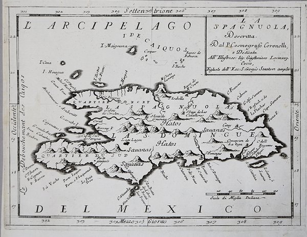 Opera tratta dal ' Corso geografico universale, o sia la terra divisa nelle sue parti e subdistinta ne' suoi gran regni. Esposta in tavole geografiche ricorrette et accresciute di tutte le nuove scoperte, ad uso dell'Accademia Cosmografica degli Argonauti dal Padre Maestro Vincenzo Coronelli M. C. Cosmografo della Serenissima Republica di Venetia. Dedicata alla Santità di Nostro Signore Innocenzo XII. P. I. In Venetia, a spese dell'autore. MDCXCII. Coronelli visse un periodo di straordinaria fecondità editoriale a partire dal 1689, quando ebbe la cattedra di geografia presso l'Università alle Procuratie, con la pubblicazione, nel 1690, del primo volume dell'Atlante Veneto. In effetti sotto il nome di ' Atlante Veneto ' va tutta la raccolta di tredici opere composte nell'arco del decennio successivo, dall'Isolario ' allo ' Specchio del mare. In realtà solo alcune di tali opere possono definirsi atlante, e sono di valore molto disuguale, dato che si passa da opere originali e fondamentali come quelle citate o il ' Corso Geografico ' ad opere di compilazione o semplici raccolte di vedute. Il ' Corso Geografico ' uscì in diverse edizioni con numeri diversi di carte - sessantotto tavole nel 1689-92; di centosettantatré tavole nel 1692; duecentosessanta tavole, nel 1694-97 - che venivano vendute anche separatamente, al ritmo di sei carte al mese per due anni. Le carte furono incise tra il 1688 e il 1692 nell'attrezzatissima officina cartografica del convento dei Frari, dove lavoravano anche incisori stranieri. ' Incisione in rame, in ottimo stato di conservazione. The map is taken from ' Corso geografico universale, o sia la terra divisa nelle sue parti e subdistinta ne' suoi gran regni. Esposta in tavole geografiche ricorrette et accresciute di tutte le nuove scoperte, ad uso dell'Accademia Cosmografica degli Argonauti dal Padre Maestro Vincenzo Coronelli M. C. Cosmografo della Serenissima Republica di Venetia. Dedicata alla Santità di Nostro Signore Innocenzo XII. P. I. In Venetia, a spese dell'autore. MDCXCII. Coronelli lived a period of extraordinary editorial fecundity starting from 1689, when he had the chair of geography at the University at the Procuratie, with the publication, in 1690, of the first volume of the ' Atlante Veneto. Under the name of ' Atlante Veneto ' goes the entire collection of thirteen works composed over the next decade, from the ' Isolario ' to the ' Specchio del mare. ' In reality, only some of these works can be defined as atlas, and are of very unequal value, since we go from original and fundamental works such as those mentioned or the ' Corso Geografico ' to works of compilation or simple collections of views. The ' Corso Geografico ' came out in several editions with different numbers of maps - sixty-eight maps in 1689-92; one hundred and seventy-three maps in 1692; two hundred and sixty maps in 1694-97 - which were also sold separately, at the rate of six a month for two years. The maps were alle engraved between 1688 and 1692 in the well-equipped cartographic workshop of the Frari convent, where foreign engravers also worked. ' Copperplate, in good condition. Cfr.