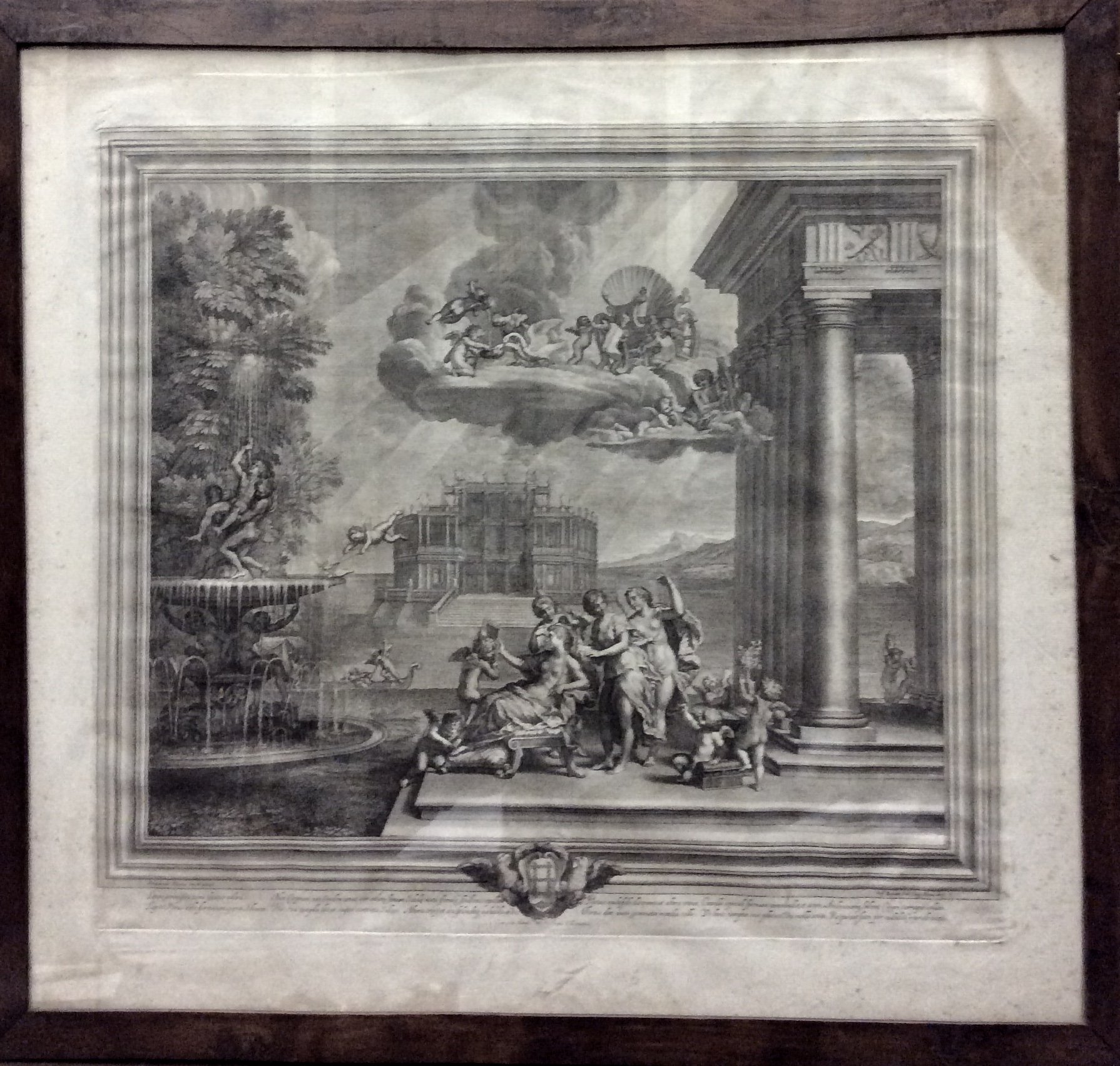 Grande e bellissima incisione a bulino (cm. 59 x 65,5 alla battuta) eseguita Etienne Baudet (Vineuil, 1638 - Parigi, 1711), tratta da un dipinto di Francesco Albani (1578-1660), il quale.. volgendosi poi a una visione sempre più vicina a quella del Domenichino, crea una serie di opere di un raffinato classicismo, quali le "quattro Storie di Venere" ora nella Galleria Borghese (Cfr. Treccani online).Ben conservata, con cornice in legno (cm. 78,5 x 83).