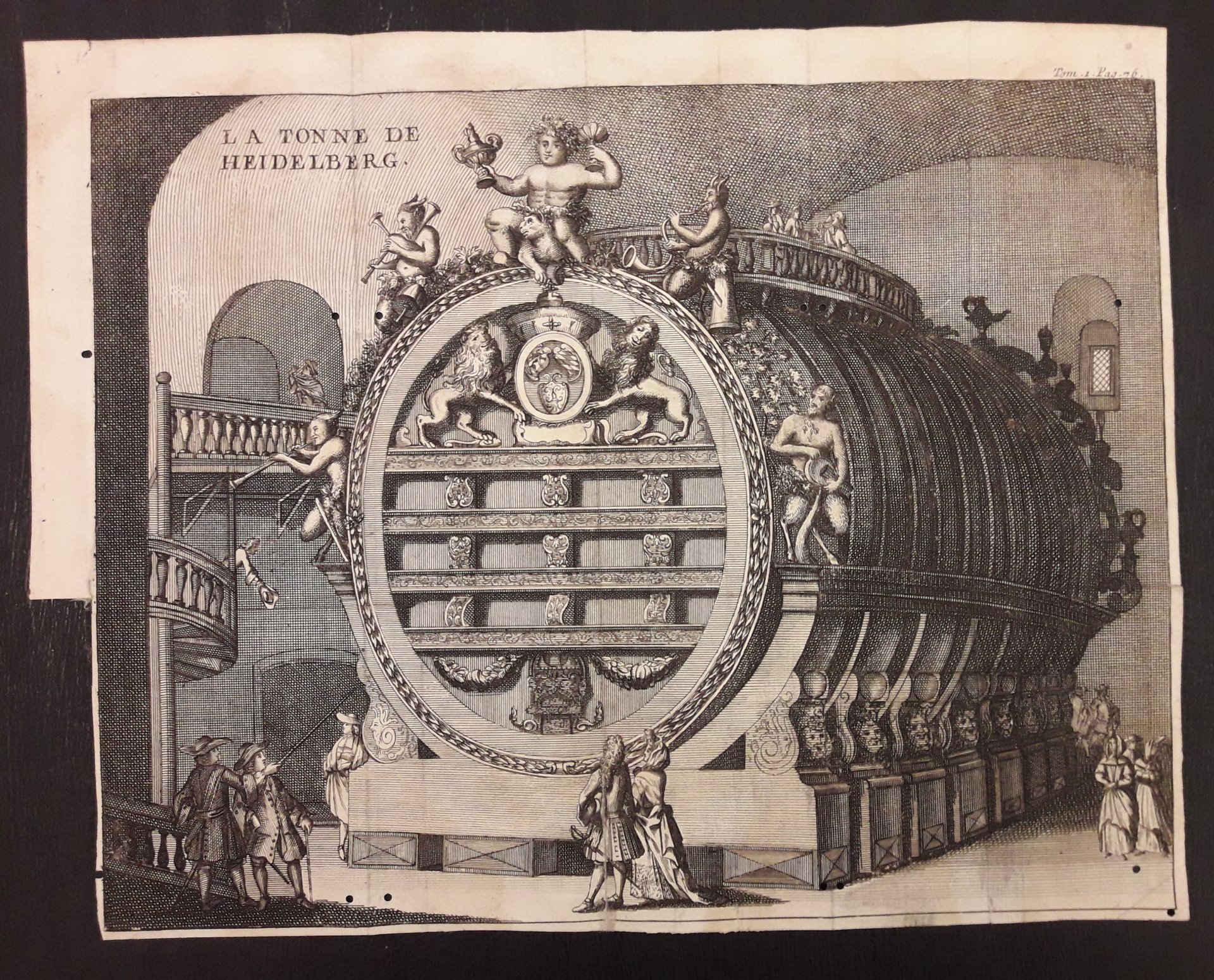Incisione (mm 271x212). Il famoso Heidelberg Tun è un'enorme vasca di vino. Si trova nelle cantine del castello di HEIDELBERG. Secondo il British Museum, questa è la copia di una stampa fatta intorno al 1664. E' di solito proveniente dal volume di Maximilien Misson: NOUVEAU vOYAGE D'iTALIE, 1702.