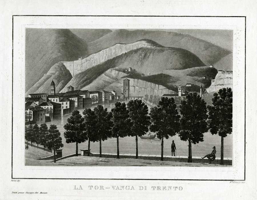 Calcografia di dimensioni 162x244 mm. Condizioni : USATO - Stato : Buono, ordinari segni d'uso e del tempo. Altre note : Singolare veduta raffigurante la città di Trento con particolare attenzione rivolta alla torre Vanga e al panorama fluviale. In primo piano filare d'alberi lungo le rive del fiume Adige e scene di vita quotidiana. La stampa si trova in "I castelli del Tirolo colla storia delle relative antiche potenti famiglie" di Agostino Perini.