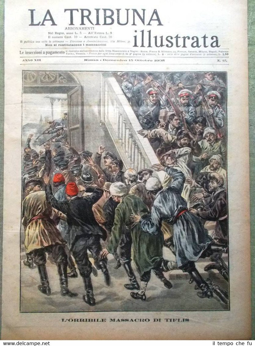 La Tribuna Illustrata Rivista originale del 15 Ottobre 1905 Anno 13 - N. 42 Rarità per appassionati e collezionisti Seguono solo alcuni dei fatti descritti, illustrati e fotografati all'interno Illustrato in copertina (segue foto): L'orribile massacro di Tiflis Illustrato nella retro copertina (segue foto): Una bizzarria di Miss Alice Roosevelt Nelle pagine interne: Le prime case operaie in Roma. Il water-polo a villa Umberto I a Roma. Il Re visita la tomba di Garibaldi a Caprera. Intorno al monumento di S. Maria Capua Vetere. Le rovine del terremoto calabrese. .e tanto altro ancora! Qualora vogliate maggiori delucidazioni contattateci In questo negozio troverai un'intera categoria dedicata alle Tribune Illustrate, sotto il link diretto alla collezione: Riviste disponibili Cliccaci sopra, troverai di certo ciò che cerchi! La Tribuna Illustrata fu un settimanale italiano pubblicato a Roma. Insieme a La Domenica del Corriere e a L'Illustrazione Italiana fu il settimanale illustrato preferito dagli Italiani nel periodo che intercorse dalla fine dell'800 all'avvento della televisione. Fondato nel 1890 come supplemento del quotidiano La Tribuna, il primo numero uscì il 6 gennaio, il formato della rivista era cm 27 x 38, un formato poco più grande del tabloid. La prima ed ultima pagina erano a colori, disegnate da pittori e incisori affermati. Ogni numero conteneva 16 pagine. I principali collaboratori furono: Luigi Capuana, Adolfo De Bosis, Alfredo Fabrizi, Gandolin, Giuseppe Giacosa, Attilio Luzzato, Enrico Panzacchi, Rastignac, Attilio Sarfatti, Armand Silvestre, Ettore Socci, Gaspare Ungarelli, Pio Vanzi, Annie Vivanti. Il Corredo iconografico fu di prim'ordine. I principali pittori, disegnatori ed illustratori furono: Basilio Cascella e i figli Tommaso e Michele, Enrico Lionne, Aleardo Terzi, Augusto Bompiani, Roberto Bompiani, Domenico Bruschi, Modesto Faustini, Rubens Santoro, Rafael Senet, Cesare Tiratelli. Tra i romanzi a puntate che vi uscirono ricordiamo: L'invincibile, di Gabriele D'Annunzio Una giovinezza, di Francois Coppée e Zia Aurelia di André Theuriet, questi ultimi due entrambi illustrati da Emile Bayard. Paypal Carta di credito Bonifico bancario Spedizione con posta prioritaria o raccomandata scelta dall'acquirente nel momento del pagamento