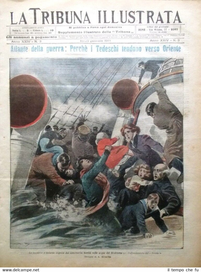 La Tribuna Illustrata Rivista originale del 16-23 Gennaio 1916 Anno 24 - N. 3 Rarità per appassionati e collezionisti Seguono solo alcuni dei fatti descritti, illustrati e fotografati all'interno Illustrato in copertina (segue foto): Le insidiose e codarde imprese dei sottomarini nemici nelle acque del Mediterraneo: l'affondamento del "Persia" Illustrato nella retro copertina (segue foto): Sanguinosa via crucis di un valoroso sovrano: la tragica fuga del vecchio Re di Serbia attraverso le gole di Ciafmalit Nelle pagine interne: Ricordando Tommaso Salvini. Popoli eroici: la guerra nel Montenegro. Il grande atlante della guerra: perché i tedeschi tendono verso oriente. La festa della Befana. I caduti per la patria (fotografie). .e tanto altro ancora! Qualora vogliate maggiori delucidazioni contattateci In questo negozio troverai un'intera categoria dedicata alle Tribune Illustrate, sotto il link diretto alla collezione: Riviste disponibili Cliccaci sopra, troverai di certo ciò che cerchi! La Tribuna Illustrata fu un settimanale italiano pubblicato a Roma. Insieme a La Domenica del Corriere e a L'Illustrazione Italiana fu il settimanale illustrato preferito dagli Italiani nel periodo che intercorse dalla fine dell'800 all'avvento della televisione. Fondato nel 1890 come supplemento del quotidiano La Tribuna, il primo numero uscì il 6 gennaio, il formato della rivista era cm 27 x 38, un formato poco più grande del tabloid. La prima ed ultima pagina erano a colori, disegnate da pittori e incisori affermati. Ogni numero conteneva 16 pagine. I principali collaboratori furono: Luigi Capuana, Adolfo De Bosis, Alfredo Fabrizi, Gandolin, Giuseppe Giacosa, Attilio Luzzato, Enrico Panzacchi, Rastignac, Attilio Sarfatti, Armand Silvestre, Ettore Socci, Gaspare Ungarelli, Pio Vanzi, Annie Vivanti. Il Corredo iconografico fu di prim'ordine. I principali pittori, disegnatori ed illustratori furono: Basilio Cascella e i figli Tommaso e Michele, Enrico Lionne, Aleardo Terzi, Augusto Bompiani, Roberto Bompiani, Domenico Bruschi, Modesto Faustini, Rubens Santoro, Rafael Senet, Cesare Tiratelli. Tra i romanzi a puntate che vi uscirono ricordiamo: L'invincibile, di Gabriele D'Annunzio Una giovinezza, di Francois Coppée e Zia Aurelia di André Theuriet, questi ultimi due entrambi illustrati da Emile Bayard. Paypal Carta di credito Bonifico bancario Spedizione con posta ordinaria o raccomandata scelta dall'acquirente nel momento del pagamento