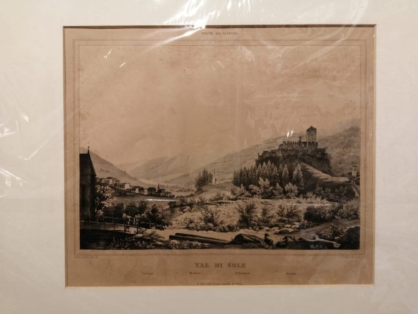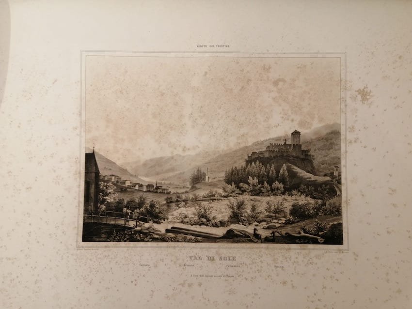 Litografia di dimensioni 213x292 mm su foglio di dimensioni 600x410 mm. Condizioni : USATO - Stato : Buono, ordinari segni d'uso e del tempo, evidenti segni di foxing. Altre note : Ampia veduta raffigurante la Val di Sole comprendente i paesi di Cusiano, Mezzana, Pellizzano e Ossana. In posizione dominante sulla destra il castello di Ossana, ma si può vedere anche la parrocchiale della Natività di Maria. Scheda bibliografica tratta da "Basilio Armani: panorami dal Garda al Tirolo" a cura di Marina Botteri Ottaviani, scheda n. 65.