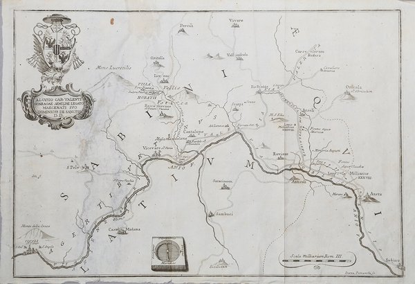 Carta georgafica della valle dell'Aniene; si sestende da Tivoli a Subiaco.La carta è tratta dalle "Dissertazioni sopra I. La villa d'Orazio Flacco. II. Il mausoleo de' Plauzi in Tivoli. III. Antino, citta? municipio ne' Marsi, dell' avvocato D. Domenico De Sanctis beneficiato della basilica Vaticana dedicate all' eminentissimo signor cardinale Luigi Valenti Gonzaga legato del' Emilia e dell' esarcato di Ravenna" di Domenico de Sanctis, stampato a Ravenna nel 1784 da Antonio Roveri.Incisa da Giovanni Petroschi, l'opera è dedicata a Luigi Valenti Gonzaga (Roveredo di Guà, 15 ottobre 1725 – Roma, 29 dicembre 1808), cardinale già segretario di stato di papa Benedetto XIV.Incisione in rame, in buono stato di conservazione. Rara. Carta georgafica della valle dell'Aniene; si sestende da Tivoli a Subiaco.La carta è tratta dalle "Dissertazioni sopra I. La villa d'Orazio Flacco. II. Il mausoleo de' Plauzi in Tivoli. III. Antino, citta? municipio ne' Marsi, dell' avvocato D. Domenico De Sanctis beneficiato della basilica Vaticana dedicate all' eminentissimo signor cardinale Luigi Valenti Gonzaga legato del' Emilia e dell' esarcato di Ravenna" di Domenico de Sanctis, stampato a Ravenna nel 1784 da Antonio Roveri.Incisa da Giovanni Petroschi, l'opera è dedicata a Luigi Valenti Gonzaga (Roveredo di Guà, 15 ottobre 1725 – Roma, 29 dicembre 1808), cardinale già segretario di stato di papa Benedetto XIV.Incisione in rame, in buono stato di conservazione. Rara. Cfr.