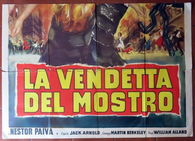 Parte inferiore di manifesto in offset, cm 98 x 138. Prima originale edizione del 1955. Rarissimo, a maggior ragione nella versione grande. "La vendetta del mostro" ("Revenge of the Creature") è un film del 1955 diretto da Jack Arnold. Il film, girato in 3D, è un fanta - horror, seguito del più celebre "Il mostro della laguna nera", diretto sempre da Arnold nel 1954. In Italia il film fu distribuito per la prima volta da Universal International nel 1959. Ebbe a sua volta un seguito, "Il terrore sul mondo" ("The Creature Walks Among Us") del 1956. Secondo capitolo della trilogia "Il mostro della laguna nera". Due ricercatrici oceanografiche riescono a catturare un misterioso uomo - pesce e lo trasportano in un parco acquatico della Florida per metterlo in mostra ai visitatori. Qui, due biologi marini, il dottor Clete e la sua assistente Helen, mossi da compassione, provano a insegnargli qualche parola di inglese per aiutarlo a sopravvivere ma l’uomo - pesce riesce a liberarsi, facendo esplodere tutta la furia che ha accumulato stando in cattività. La sola parte inferiore, con strappi da rimarginare in corrispondenza delle pieghe di chiusura del foglio.