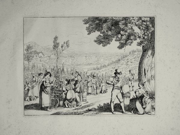Incisione originale all'acquaforte, di grandi dimensioni e non comune, con ampi margini bianchi disegnata ed incisa da Achille Pinelli in cui raffigura donne ed uomini impegnati nella raccolta dell'uva. Bello lo sfondo che, appena accennato, delinea una bella vallata fra le colline, in primo piano a destra una figura femminile allatta un bambino mentre conversa con un contadino.