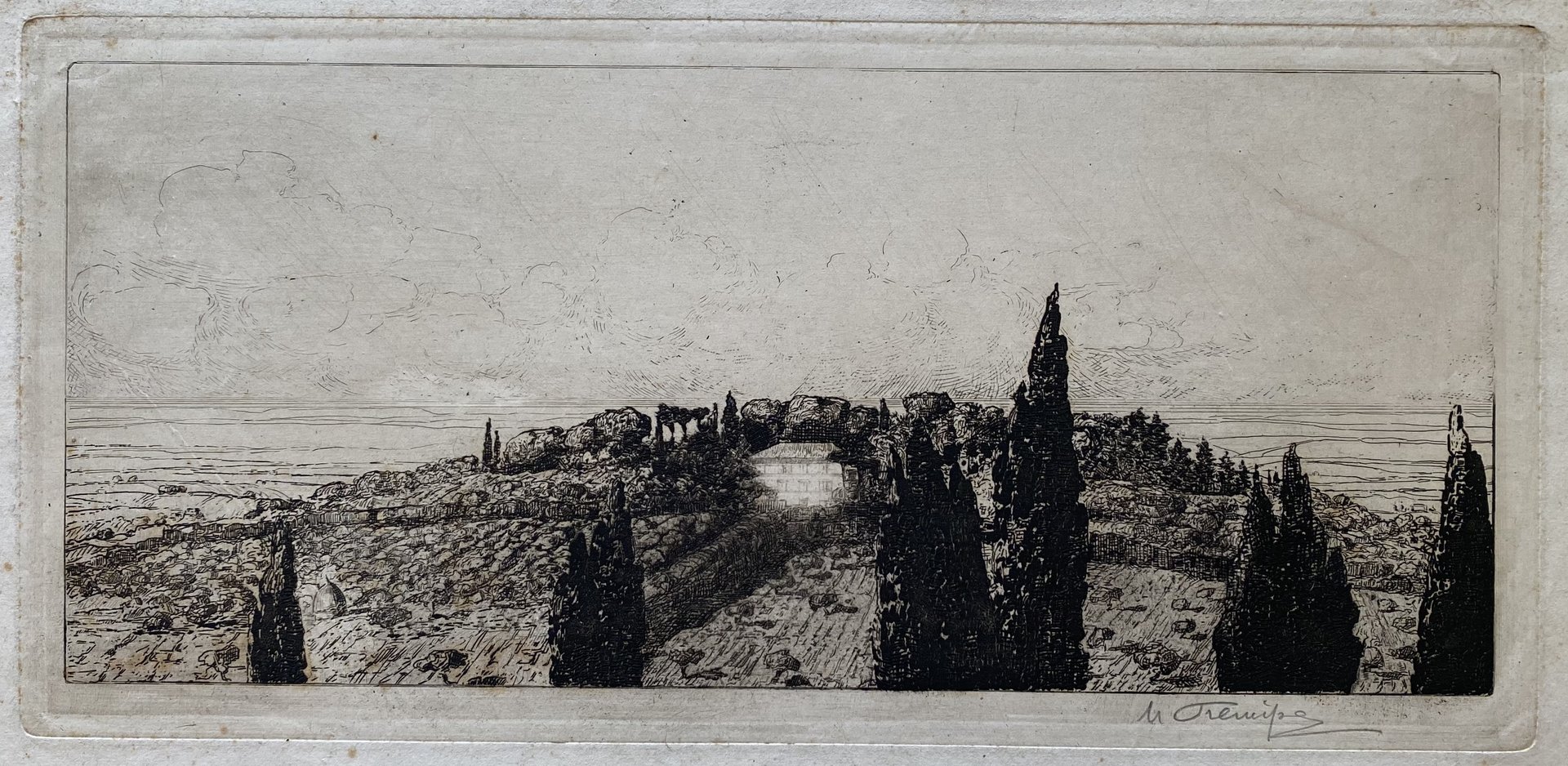 Immersa completamente nel paesaggio rigoglioso dei Colli Albani viene rappresentata, medianti intensi giochi chiaroscurali, villa Cavalletti. Prencipe nel 1900 decide di dedicarsi esclusivamente al Paesaggio, ora con esiti simbolisti e decadenti, ora con esiti intimi e solitari, intellettuali come in questo foglio. Lastra commissionata dalla marchesa Cavalletti di Frascati è stata esposta nel 1918 a Milano, nel 1923 a Napoli, nel 1950 a Roma e nel 1953 a Frascati. Prova di lavoro, avanti la riduzione della lastra, che nello stato definitivo misura 140 x 325 mm. Firma a matita in basso a destra. Foglio proveniente dalla collezione privata del fondatore della Libreria Perera (Roma 1911), Armando Perera era amico e collaborava con tutti i principali pittori incisori della sua epoca.