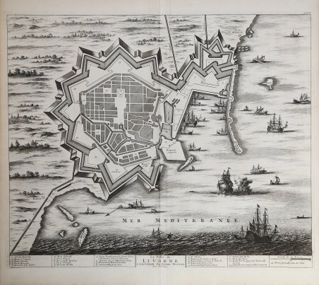 Pianta del porto e della città di Livorno. Esemplare tratto dal primo volume del ' Nouveau Theatre de l'Italie ' pubblicato ad Amsterdam nel 1704/5 e nel 1724, quale integrazione al progetto di Johannes Baleu, iniziato nel 1663, del grande "libro delle città", manchevole delle piante di gran parte della parte settentrionale della penisola. Il Blaeu, durante la sua lunga attività editoriale pubblica tre volumi sulle città italiane. Nel 1663 i primi tre, suddivisi in Stato della Chiesa, Roma e Regno di Napoli e Sicilia. Alla sua morte i suoi eredi danno alla luce altri due volumi datati 1682 incentrati sulle città del Piemonte e della Savoia, poi ristampati da altri editori nel 1693 e 1697. Il francese Pierre Mortier pubblica una ristampa nel 1704/5, intitolata “Nouveau Theatre de l’Italie”. L’opera è in quattro volumi e comprende le lastre del Blaeu, ritoccate e modificate in piccola parte, integrate dall’aggiunta di numerose nuove mappe di proprio disegno, raffiguranti le città della parte settentrionale della penisola, racchiuse nel primo volume dell’opera.L’atlante del Mortier venne pubblicato con testo latino, francese ed olandese. La particolarità che differenzia le due edizioni di Blaeu e Mortier è rappresentata dal fatto che il testo non è al verso della singola mappa (che quindi è bianca nel retro), ma si trova all’inizio di ogni singolo volume. Il grande successo dell’opera diede origine ad un’ulteriore ristampa, praticamente identica, curata da R. Alberts ed edita nel 1724/5. Incisione in rame, in buono stato di conservazione. Pianta del porto e della città di Livorno. Esemplare tratto dal primo volume del ' Nouveau Theatre de l'Italie ' pubblicato ad Amsterdam nel 1704/5 e nel 1724, quale integrazione al progetto di Johannes Baleu, iniziato nel 1663, del grande "libro delle città", manchevole delle piante di gran parte della parte settentrionale della penisola. Il Blaeu, durante la sua lunga attività editoriale pubblica tre volumi sulle città italiane. Nel 1663 i primi tre, suddivisi in Stato della Chiesa, Roma e Regno di Napoli e Sicilia. Alla sua morte i suoi eredi danno alla luce altri due volumi datati 1682 incentrati sulle città del Piemonte e della Savoia, poi ristampati da altri editori nel 1693 e 1697. Il francese Pierre Mortier pubblica una ristampa nel 1704/5, intitolata “Nouveau Theatre de l’Italie”. L’opera è in quattro volumi e comprende le lastre del Blaeu, ritoccate e modificate in piccola parte, integrate dall’aggiunta di numerose nuove mappe di proprio disegno, raffiguranti le città della parte settentrionale della penisola, racchiuse nel primo volume dell’opera.L’atlante del Mortier venne pubblicato con testo latino, francese ed olandese. La particolarità che differenzia le due edizioni di Blaeu e Mortier è rappresentata dal fatto che il testo non è al verso della singola mappa (che quindi è bianca nel retro), ma si trova all’inizio di ogni singolo volume. Il grande successo dell’opera diede origine ad un’ulteriore ristampa, praticamente identica, curata da R. Alberts ed edita nel 1724/5. Incisione in rame, in buono stato di conservazione. Cfr.
