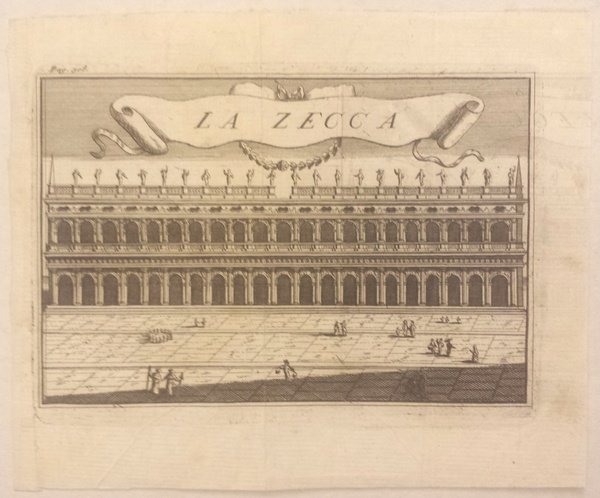 Incisione calcografica di mm. 165 x 110 alla battuta su carta di filo. Filigrana tre lune. In grande all'interno di un festone "La Zecca". Veduta originariamente stampata per la guida storica veneziana di Pacifico "Cronaca Veneta sacra e profana"