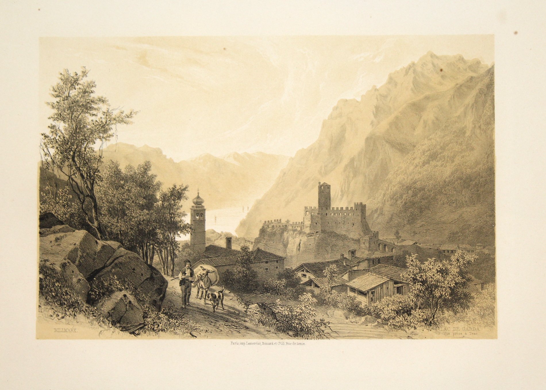Litografia in seppia con bel panorama del Garda sullo sfondo e scena di vita in primo piano col paese e castello di Tenno in secondo piano. Mm 190x282, tratta dall'albo" Pittoresk resetur fran Stockolm" pubblicato nel 1852. La veduta è firmata in basso a s.:"Billmark" e sotto nel centro: " Paris, imp. Lemercier rue de Sein, 55". Ottimo esemplare marginoso. <BR><BR>