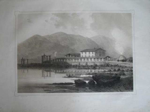 Lemercier, Parigi, 1851. Dall’opera “Album des diverses localitée formant les etablissements industriales d’acide boracique fondé en Toscane”, tonolitografia (nero /seppia), cm 28, 5 x 41,3 (la parte figurata), cm 42 x 59, 2 (il foglio). Disegnata da E. Chelli, litografata da Eugenio Ciceri e impressa da Lemercier, la veduta raffigura Lago con gli insediamenti industriali intorno al 1820, animata da persone. La presenza di acque bollenti e putride nella zona era nota fin dall’antichità. L’attività di sfruttamento dei vapori caldi, per ricavare acido borico, iniziò nel 1827, grazie all’ingegnere e imprenditore francese François Jaques de Larderel (Vienna, 5 agosto 1790 – Firenze, 15 giugno 1858), il quale promosse lo sfruttamento industriale dei soffioni boraciferi nella frazione del comune di Pomarance, attualmente nota come Larderello, appunto dal nome dello stesso Larderel. Le vedute si riferiscono quindi all’impianto dei primi stabilimenti, intorno al 1830. Successivamente fu il principe Ginori a comprendere le potenzialità del luogo per produrre energia (ingabbiando il vapore sotto delle cupole si poteva ottenere energia elettrica) e a incentivarne lo sfruttamento. Leggerissimo foxing ai margini bianchi. Peraltro bella la veduta in buono stato.