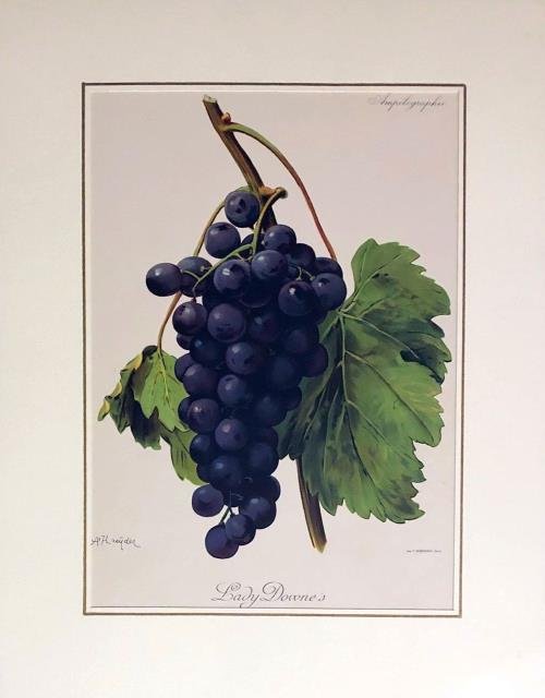 Tratta da "Ampélographie. Traité général de viticulture", Imp. F. Champenois, Paris. 1901 e il 1910. Cromolitografia, cm, 24 x 34, illustrazione di A. Kreyder. Pierre Viala (1859 - 1936) - Victor Vermorel (1848 - 1927). Ottimo stato di conservazione. .