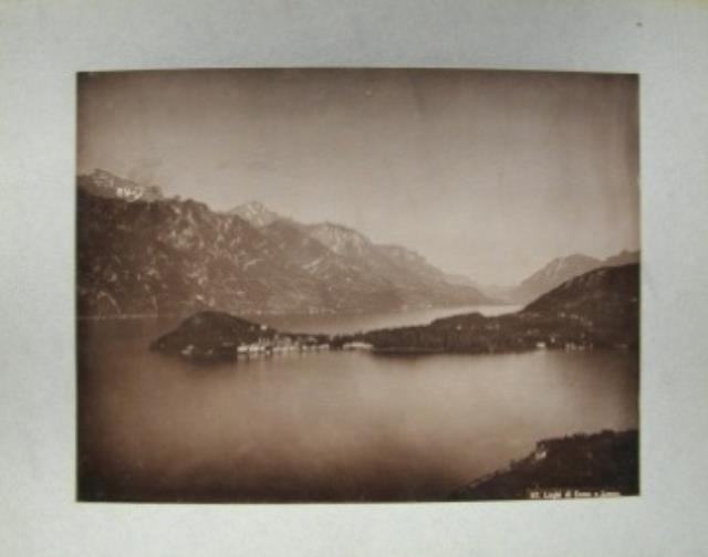 Fine '800 – primissimo '900. Fotografia d'epoca all'albumina stampata su buona carta fotografica e applicata su cartoncino, cm 21 x 27,5 circa (la foto), titolo stampato in basso a destra. Ampia veduta a volo d'uccello all’incrocio dei tre rami con la penisola di Bellagio. Ottime condizioni.