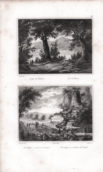 Veduta tratta dal celebre ' L'Italie, la Sicile, les Iles Éoliennes, l'Ile d'Elbe, la Sardaigne, Malte, l'Ile de Calypso etc. D'après les inspirations, les recherches et les travaux de M. M. le Vicomte de Chateaubriand, De Lamartine, Raoul-Rochette, le Comte de Forbin, Piranesi, Mazzara, et de Napoléon, Denon, Saint-Non, Lord Byron, Goethe, Visconti, Cicognara, Lanzi, de Bonstetten, Swinburne, etc. Sites, Monumens, Scènes et Costumes, d'après M.me Haudebourt-Lescot, MM. Horace-Vernet, Granet, Isabey, Ciceri, Mazzara, le Major Light, le Cap. Batty, Cooke, Gell et Gandy, Pinelli, Ferrari, Zucoli, et beaucoup d'autres artistes italiens. Recueillis et publiés par Audot Père, Membre de la Société de Géographie, ' edito a Parigi tra il 1834 ed il 1837 e ristampato a Torino [Giuseppe Pomba e Ca, 1834-1838]. L'opera, in cinque volumi, raccoglie scritti di autori vari, curati da Audot, ed è riccamente illustrata da 324 incisioni su acciaio fuori testo, molte delle quali con accostamento multiplo, per un totale di 473 tavole. Fu notoriamente mastodontico il lavoro cui si sottopose Louis Eustache Audot (1783-1870). View taken from the famous ' L'Italie, la Sicile, les Iles Éoliennes, l'Ile d'Elbe, la Sardaigne, Malte, l'Ile de Calypso etc. D'après les inspirations, les recherches et les travaux de M. M. le Vicomte de Chateaubriand, De Lamartine, Raoul-Rochette, le Comte de Forbin, Piranesi, Mazzara, et de Napoléon, Denon, Saint-Non, Lord Byron, Goethe, Visconti, Cicognara, Lanzi, de Bonstetten, Swinburne, etc. Sites, Monumens, Scènes et Costumes, d'après M.me Haudebourt-Lescot, MM. Horace-Vernet, Granet, Isabey, Ciceri, Mazzara, le Major Light, le Capt. Batty, Cooke, Gell et Gandy, Pinelli, Ferrari, Zucoli, et beaucoup d'autres artistes italiens. Recueillis et publiés par Audot Père, Membre de la Société de Géographie, ' published in Paris between 1834 and 1837 and reprinted in Turin [Giuseppe Pomba e Ca, 1834-1838]. The work, in five volumes, collects the writings of various authors, edited by Audot, and is richly illustrated with 324 engravings on steel outside the text, many of them with multiple combinations, for a total of 473 tables. Louis Eustache Audot (1783-1870) was a notoriously mammoth task. Cfr.
