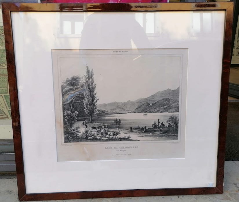 Litografia di dimensioni 230x310 mm, in cornice di misure 500x400 mm circa. Condizioni : USATO - Stato : Buono, ordinari segni d'uso e del tempo. Altre note : Bella veduta di Basilio Armani raffigurante il lago di Caldonazzo, nella Valsugana. Presenti sul lato inferiore della singola stampa le iscrizioni "Gez. v. Armani - Gedruckt bei I.B. Kuhn in München". Scheda bibliografica tratta da "Basilio Armani: panorami del Garda e del Tirolo" a cura di Marina Botteri Ottaviani, scheda n. 67.
