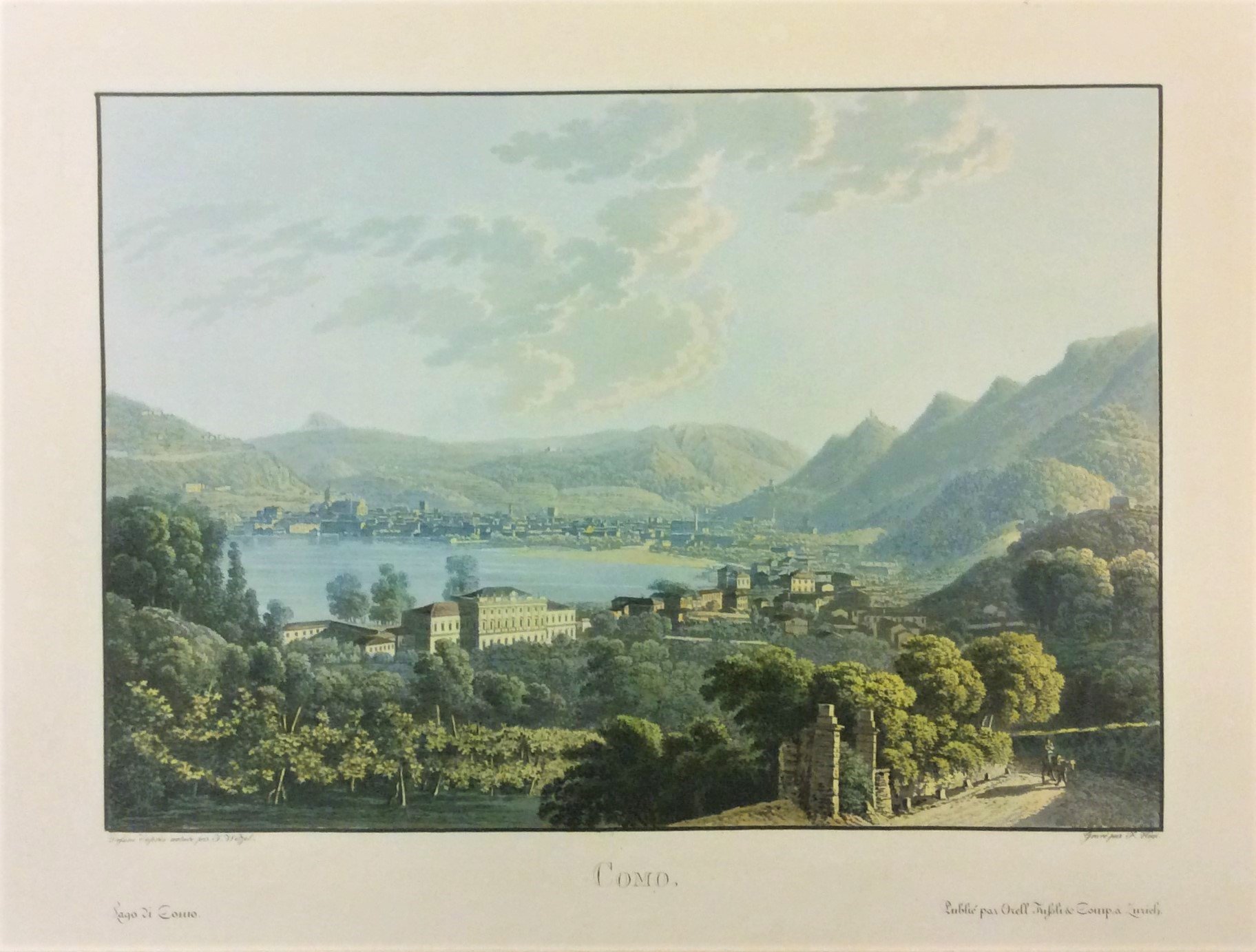 Magnifica acquatinta incisa da F. Hegi (cm. 19,2 x 27,4, più i larghi margini) da disegno dal vero di Johann Jacob Wetzel, stampata a colori (è posta sotto passe-partout). Cfr. Como e Lecco nelle antiche stampe, n. 70: COMO (titolo in basso nel m.). Veduta della città presa dalla parte di Villa Olmo. La stampa è firmata: in basso a s.: "Dessiné d'apres nature par J. Wetzel" e a d.: "Gravé par F. Hegi. "Molto rara", fa parte di una splendida serie di acquatinte pubblicata a Zurigo nel 1822 da Orell Fuessli ad illustrazione del "Voyage pittoresque au lac de Come": i disegni sono di Johann Jacob Wetzel (1781-1834) mentre le incisioni sono opera di diversi autori tra cui Franz Hegi (1774-1850). Questa serie, di cui fanno parte numerose altre vedute riguardanti diverse località del lago (in totale 15), è ritenuta da molti critici la più bella tra quelle dedicate al Lago di Como. Essa è a sua volta parte di una serie di volumi dedicati dagli stessi autori ai laghi svizzeri e padani. Tutte le stampe di questa serie riportano in basso a s.: "Lago di Como" e in basso a d.: "Publié par Orell Fussli & Comp. à Zurich". Esemplare ben conservato.