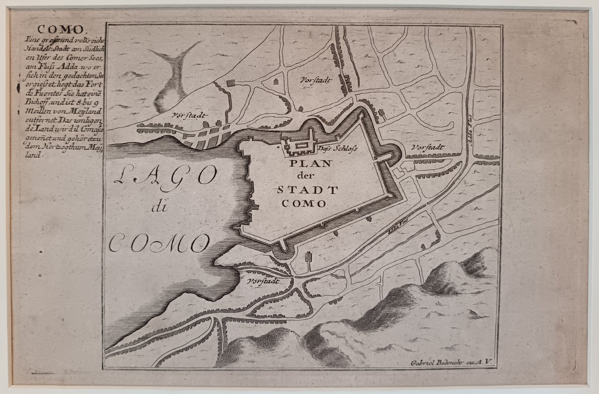 La lastra era inserita nell'opera Curioses Staats und Kriegs Theatrum di Gabriel Bodenehr, pubblicata ad Augsburg nel 1725. Pianta fortificata della città di Como con a sinistra, oltre la linea di inquadramento, il titolo e in tedesco descrizione della città. In basso a destra: Gabriel Bodenehr exud. A.V.