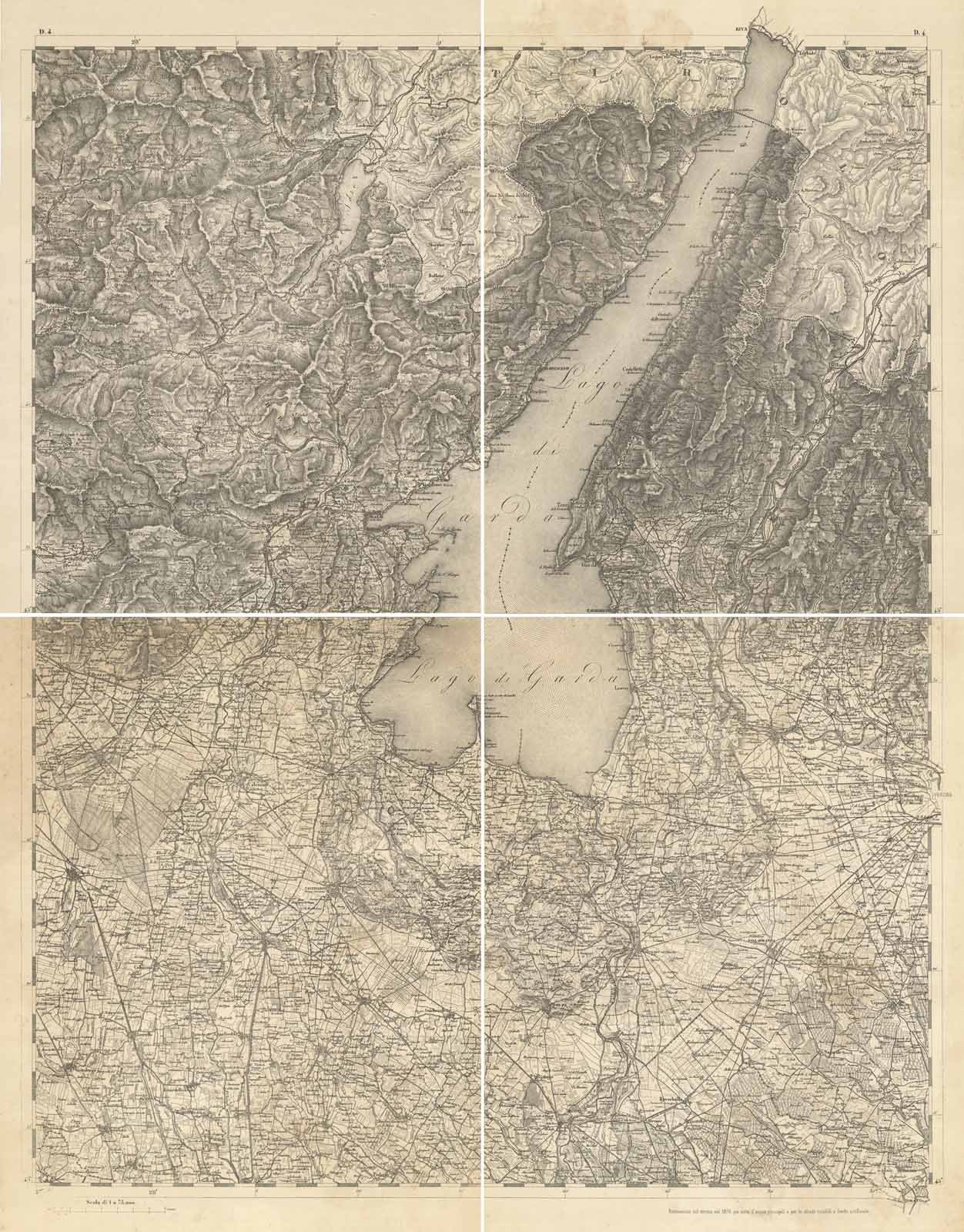 Raffigurazione topografica, in quattro fogli, del lago di Garda e delle località ad esso circostanti fino a Goito realizzata alla scala di 1 a 75000 "Riconosciuto sul terreno nel 1876 pei corsi d'acqua principali e per le strade rotabili a fondo artificiale" da parte dell'Istituto Topografico Militare. Nello specifico i fogli sembrano essere un aggiornamento, più grandi per dimensioni, del foglio D4 e D5 della grande "Carta Topografica del Regno Lombardo-Veneto costrutta sopra misure astronomico-trigonometriche." che venne pubblicata dall'Istituto Geografico Militare dell'I. R. Stato Maggiore Generale Austriaco pubblicata nel 1833 e rettificata l'anno 1856. Autore: Istituto Topografico Militare. Luogo: Lago di Garda - Lombardia. Anno: 1876 ca. Tecnica: fotolitografia. Dimensioni: 780x990 mm. Ottimo lo stato di conservazione