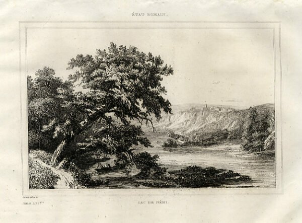 LAGO DI NEMI - "Lac de Nèmi" suggestivo paesaggio con alberi aggettanti sul lago.