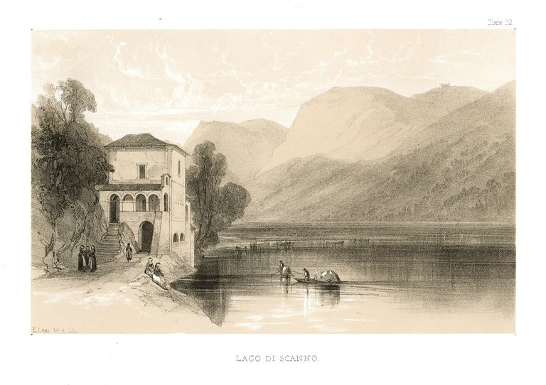 Veduta, antica ed originale, del Lago di Scanno stampata su fondino seppia. Inserita nel secondo volume dell’opera “Illustrated excursions in Italy by Edward Lear” London: Thomas M’Lean, 26, Haymarket M.DCCC.XLVI.