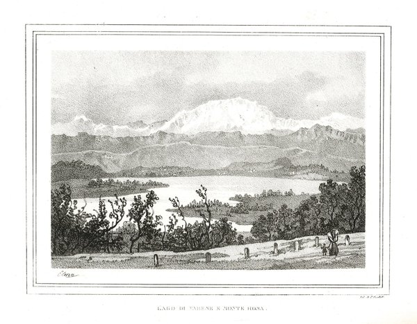 Stampa antica ed originale con veduta del Lago di Varese preso "sotto la strada che da Varese mette a Gallarate.Lo difende dalla tramontana una giogaia.chiamata Campo dei Fiori.". Fa da sfondo l'imponente ed affascinante Monte Rosa.Rif: Trippini, Foglia "Varese nelle antiche stampe XVII.XIX secolo", p. 266, n° 109a