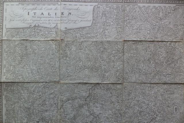 Dalla “Topographische Carte des Konigreichs Italien. Mit angranzenden Landern”. Wien, Artaria und Comp. 1830 circa. Incisione su acciaio applicata su tela, b/n, cm 41,8 x 61,5 (il foglio). Disegnata dal Pinetti e edita dall'Artaria, dettagliata carta di gran parte della Lombardia, con i laghi e la Valtellina. Buona conservazione.