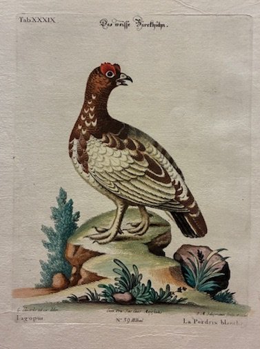 Incisione originale su rame (cm. 22x28,5 più ampi margini bianchi) tratta dalla ricercata opera ‘Sammlung verschneider auslandischer und seltener Vogel’. Coloritura d’epoca all’acquarello. Esemplare in ottimo stato di conservazione.