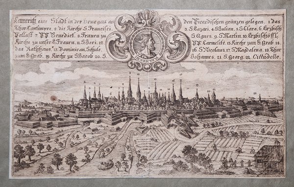 Veduta panoramica della città tratta dal Sachsischer Postillon, opera stampata in dispense dal 1784 al 1804. Data la particolare struttura dell’opere queste vedute sono molto rare e quasi sempre mancanti alle collezioni ed ai repertori specializzati. Incisione in rame, leggere bruniture nel margine inferiore, per il resto in ottime condizioni. Panoramic view of the city from Sachsischer Postillon, a work printed between 1784 and 1804. For the particular structure of that work these views are very rare and almost always missing in specialized collections and repertoires. Copper engraving, light burnishing in the lower margin, but in excellent condition. Cfr.