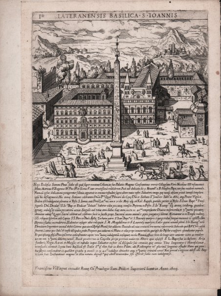 Acquaforte e bulino, 1609, firmata e datata in basso. L'opera appartiene ad una serie di 7 tavole raffiguranti sei Basiliche di Roma. Ciascuna tavola presenta in alto al centro, il nome latino della basilica; una veduta prospettica, di circa 142x130mm; sotto l’immagine, una lunga notazione di carattere storico sull’edificazione della chiesa, sui relativi culti e le reliquia conservate.In fondo alla prima tavola - San Giovanni in Laterano - troviamo ' l’excudit Franciscus Vill’a?na excudit Rom?. C? Privilegio Sum. Pont et Superior? licentia Anno 1609. L’opera è di estrema rarità e non è censita nei principali repertori.La raccolta era presente nella collezione del Palazzo Massimo, come si apprende da Vittorio Massimo, in ' Notizie istoriche della Villa Massimo alle Terme Diocleziane… del 1836. Magnifica prova, impressa su carta vergata coeva, con margini, applicata su supporto cartaceo coevo (probabile l'appartenenza ad un piccolo album), in ottimo stato di conservazione. ' Etching and engraving, 1609, signed and dated at the bottom. The work belongs to a series of 7 plates depicting Basilicas of Rome. Each plate presents in the upper center, the Latin name of the church; a perspective view, about 142x130mm; below the image, a long historical notation about the building of the church, its cults and relics preserved. At the bottom of the first panel - San Giovanni in Laterano - we find the excudit ' Franciscus Vill'a?na excudit Rom?. C? Privilegio Sum. Pont et Superior? licentia Anno 1609. The work is extremely rare and is not listed in the main repertories. The collection was present in the collection of the Palazzo Massimo, as we learn from Vittorio Massimo, in ' Notizie istoriche della Villa Massimo alle Terme Diocleziane. of 1836. Magnificent proof, printed on contemporary laid paper, with margins, applied to contemporary paper (probably belonging to a small album), in excellent condition. ' Cfr.