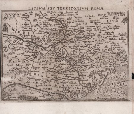 Carta geografica della regione, tratta dall'Itinerario d'Italia ' di Francesco Scoto, edito da Matteo Cadorin, il cui nome si legge in basso a destra "In Padova per Matteo Cadorin. Si tratta di una tarda derivazione - in forma ridotta - della carta della ' Campagna di Roma ' di Eufrosino della Volpaia. Matteo Cadorin, chiamato il “Bolzetta” essendosi imparentato con la famiglia di Francesco Bolzetta, pubblicò diverse edizioni dell'Itinerario, ad iniziare dal 1654. Proseguì, sempre stampando a Padova, nel 1659 con almeno due edizioni distinte, quindi nel 1669 e nel 1670, quest'ultima pubblicazione ha un apparato iconografico più ricco delle altre e nelle lastre fu aggiunto “In Padova per Matteo Cadorin”. Franz Schott (1548-1622), italianizzato come Francesco Scoto, era originario di Anversa. Giureconsulto e grande viaggiatore, fratello del più noto Andreas, gesuita, filologo e antiquario, redasse "Itinerario overo decrittione de' viaggi principali in Italia". L’opera apparve per la prima volta ad Anversa in occasione del Giubileo del 1600, con il titolo di Itinerari Italiae rerumq[ue] romanarum libri tres, ' stampata nell'Officina Plantiniana da Joannes Moretus. Priva dell'apparato iconografico, era intesa a servizio dei pellegrini che si recavano in Italia ed espressione di una particolare forma di scrittura odeporica che abbracciava tutti quei testi che assumono il carattere di guida per il viaggio e si offrono come strumento rivolto ad orientare il viaggiatore nel suo percorso. Ebbe un grande successo e venne poi pubblicata in numerose edizioni successive in latino, italiano, francese e inglese. L'Itinerario d'Italia ebbe il suo pieno sviluppo nelle numerose edizioni italiane, che furono riccamente illustrate da vedute prospettiche e piante delle città. La prima edizione italiana illustrata fu curata da Pietro Bertelli e Francesco Bolzetta (Vicenza o Venezia 1601); seguirono diverse edizioni di Bolzetta con un sempre crescente numero di illustrazioni cartografiche. Il testo di Schott venne usato per le proprie edizioni dell’Itinerario d’Italia anche da Matteo Cadorin (Padova 1654 e successive) e Pietro Bigonci (Venezia 1665). Anche a Roma, nell’anno giubilare 1650, l'editore Filippo de Rossi stampa l'Itinerario overo Nuova Descrittione de' Viaggi Principali d'Italia. Le stampe sono 19 a cui si aggiunge la mappa dell'Italia e risultano leggermente più accurate. Le tavole dell'edizione romana (realizzate tramite nuove lastre di rame) furono ristampate nelle edizioni successive - accresciute - dagli editori Michelangelo e Pier Vincenzo de Rossi (1669, 1700 e 1717) e quindi in quelle curate da Fausto Amidei, mercante di libri al Corso, che fece stampare da Antonio de Rossi nel 1737 la prime delle sue tre edizioni dell'Itinerario d'Italia ' di Francesco Scoto. Le altre furono nel 1747 nella stamperia del Bernabò e Lazzarini e nel 1761 nella stamperia di Generoso Salomoni. Acquaforte, traccia della piega editoriale al centro, sporadiche fioriture in generale in buono stato di conservazione. Carta geografica della regione, tratta dall'Itinerario d'Italia ' di Francesco Scoto, edito da Matteo Cadorin, il cui nome si legge in basso a destra "In Padova per Matteo Cadorin.Si tratta di una tarda derivazione - in forma ridotta - della carta della ' Campagna di Roma ' di Eufrosino della Volpaia.Matteo Cadorin, chiamato il “Bolzetta” essendosi imparentato con la famiglia di Francesco Bolzetta, pubblicò diverse edizioni dell'Itinerario, ad iniziare dal 1654.Proseguì, sempre stampando a Padova, nel 1659 con almeno due edizioni distinte, quindi nel 1669 e nel 1670, quest'ultima pubblicazione ha un apparato iconografico più ricco delle altre e nelle lastre fu aggiunto “In Padova per Matteo Cadorin”.Acquaforte, traccia della piega editoriale al centro, sporadiche fioriture in generale in buono stato di conservazione. Cfr.