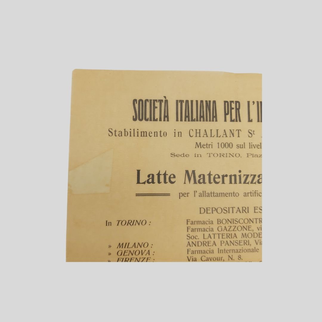 cm 26x18,5. Volantino pubblicitario su carta leggera. Società Italiana per l'Industria del Latte con sede in Torino e stabilimento in Challant St. Anselme (Valle d'Aosta). Tracce d'uso, due piccoli buchetti marginali.
