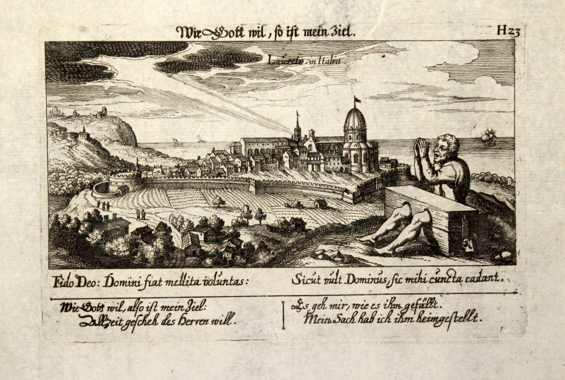 Incisione in rame, 98x160. Bella veduta prospettica con scena in primo piano, tratta da "Sciographia cosmica" e "Thesaurus philopoliticus". Ottimo esemplare ben impresso ad ampi margini.