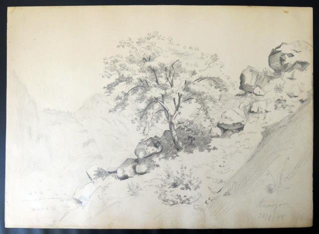 Disegno a matita grigia su carta, cm 25,5 x 35,5 circa, titolato “Lavorgo” in basso a destra e datato 30/8/94 (30 agosto 1894). Lavorgo è una piccola frazione del comune svizzero di Faido, nel Canton Ticino. Fino al 2005 è stato frazione di Chiggiogna, comune che nel 2006 è stato accorpato a Faido assieme agli altri comuni soppressi di Calonico e Rossura. Vi sorge l'oratorio di Santa Petronilla, costruito nel 1662. Il disegno rappresenta un dirupo alberato con veloci schizzi di minute abitazioni sul fondovalle. Al retro è disegnata una piccola parte di foglio sulla destra che raffigura uno scorcio con dirupo e alberi. Buono stato. .