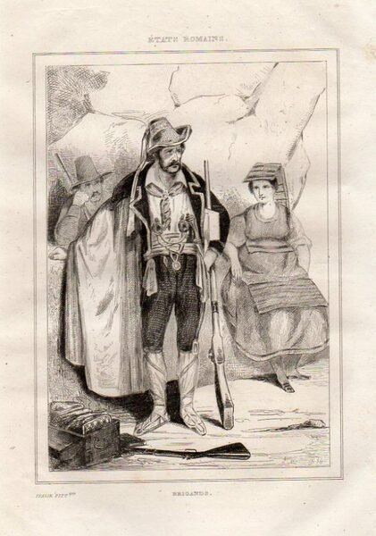 LAZIO (Costumi) - "Brigands" brigante armato in primo piano de due personaggi sullo sfondo.