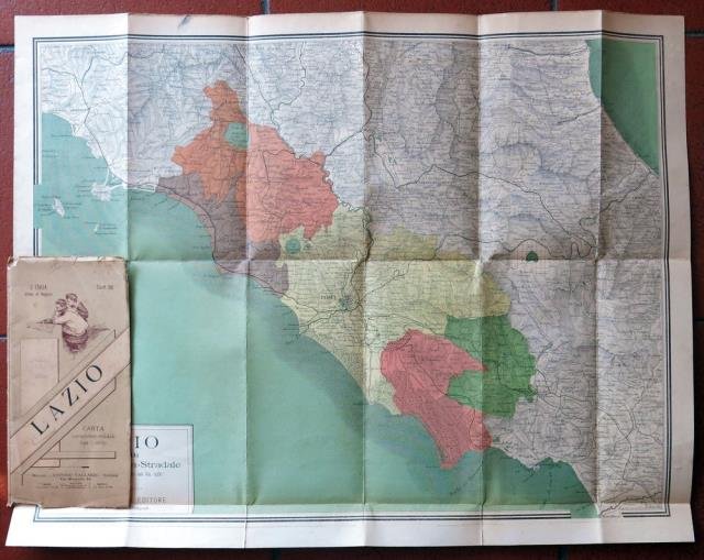 Antonio Vallardi, 1901. Dalla serie di cartine "L'Italia divisa in regioni". Grande carta ripiegata dentro astuccio in carta, cm 55 x 70,5, stampata in colore. La carta si estende da Roccastrada e Grosseto a nord, a Gaeta, Isernia e il Volturno a sud. Consuete pieghe editoriali, possibili difetti marginali e di copertina, in ottimo stato di conservazione la carta all'interno.