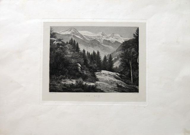 C. Lovera imp., Torino, 1870 circa. Tratta da “L'arte in Italia”, incisione su acciaio, b/n, cm 6 x 9,5 circa (alla lastra) più margini bianchi. In lastra, sulla sn. “A. Lauro inc.”, sulla ds. “C. Lovera imp.”. Piacevole veduta di scorcio di Alpi, con vegetazione e abeti, sullo sfondo le cime innevate. Agostino Lauro (1806 – 1878). Ottima conservazione.