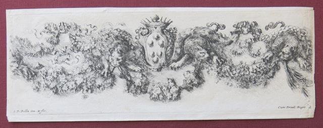 Incisione in rame all’acquaforte, 1646 / 1648 circa, b/n, cm 8,3 x 25 circa (alla lastra), firmata e datata in lastra, in bs. a sn. “S. D. Bella inv. & fec.”, a ds. “Cum Privil. Regis 2” et. Prova nel probabile secondo stato su due, impressa su carta databile alla metà del XVII secolo. Con stretto margine intorno l’impronta del rame, rifilati i margini laterali con alcune imperfezioni dovute a dei rinforzi sottostanti. Bella impressione, discreta conservazione.