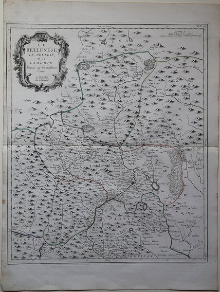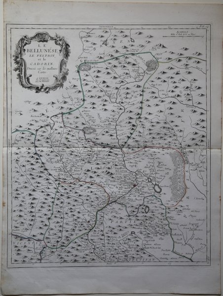 Mappa particolareggiata e finemente incisa di una parte del Veneto, approssimativamente corrispondente alla provincia di Belluno.Cartiglio decorativo con il titolo nell'angolo in alto a sinistra e notevoli dettagli topografici, rilievi mostrato in modo pittorico. Carta geografica curata da don Paolo Santini e dal fratello Francesco per il loro prestigioso Atlas universel dressé sur les meilleures cartes modernes, sontuoso atlante composto da mappe che rielaborano la più aggiornata cartografia francese in una veste veneta. Le carte sono prese dai migliori geografi del suo tempo, D’Anville, Bellin, Bonne, Borgomo, Boscovich, Clarici, Delisle, Jaillot, Janvier, Robert de Vaugondy. ' In effetti nelle carte dei Santini, vengono mescolati termini francesi con italiani, ma sono offerte con una grazia compositiva ed incisoria loro caratteristiche: una toponomastica non fitta, scritta in grande e ben leggibile. L’atlante di Santini non ebbe una grande fortuna editoriale e uscì in poche copie: venne quindi ristampato dai Remondini, che avevano acquistato dal Santini nel 1781 le incisioni in rame. Alle carte di Paolo Santini, datate fra il 1774 e il 1780, i Remondini aggiunsero diverse altre carte, datate fra il 1782 e il 1784: fra queste, nel secondo volume, la grande carte ripiegata dell’Italia, la Repubblica di Genova, la Palestina, le grandi carte dell’Africa. Paolo Santini (1729, Venezia–1793, Belluno), sacerdote cattolico presso la Chiesa di Santa Maria Formosa a Venezia, docente di disegno alle scuole della città lagunare della Provincia Veneta della Compagnia di Gesù. Santini, cartografo, incisore ed editore, aggiornò e pubblicò le mappe dei geografi e cartografi francesi Gilles Robert de Vaugondy (1688–1766) e Didier Robert de Vaugondy (c. 1723–1786), ispirandosi anche alle opere dei cartografi italiani, innanzitutto a quelle di Giovanni Antonio Rizzi Zannoni (1736–1814). Utilizzando, come modello, le mappe raccolte e pubblicate nel 1752 nell’Atlas Universel di Gilles Robert e Didier Robert de Vaugondy, acquistate a Parigi da suo fratello, Francesco Santini, e le «migliori carte geografiche» dell’epoca, Paolo Santini incise nuove lastre e diede alle stampe a Venezia, nel 1776, l’Atlas Universel dressé sur les meilleures cartes modernes. L’anno successivo, 1777, cedette i diritti di pubblicazione all’editore Giuseppe Remondini (1754–1811) di Bassano del Grappa che ristampò l’«Atlas Universel» in due volumi che raccoglievano complessivamente 123 carte geografiche. Le matrici in rame in possesso dei Santini furono poi acquistate, nel 178, dalla stamperia Remondini. Incisione in rame, coloritura coeva dei contorni, in ottimo stato di conservazione. Bibliografia NMM III, 277; Nordenskiöld 276; Phillips, Atlases 647. Rodolfo Gallo, L'incisione nel '700 a Venezia e a Bassano, in “Ateneo Veneto”, A. CXXXII, v. 128, pp. 153-214. Finely and crisply engraved map depicting part of Veneto, roughly corresponding to today province of Belluno.Decorative title cartouche in the upper left corner, relief shown pictorially. Map compiled by Don Paolo Santini and his brother Francesco, for their prestigious Atlas universel dressé sur les meilleures cartes modernes, a sumptuous Atlas composed of maps that rework the most up-to-date French cartography in a Venetian guise. The maps are taken from the best geographers of his time, D'Anville, Bellin, Bonne, Borgomo, Boscovich, Clarici, Delisle, Jaillot, Janvier, Robert de Vaugondy. ' Indeed, in Santini's maps, French terms are mixed with Italian, but they are offered with a compositional and engraving grace that is characteristic of them: an uncluttered toponymy, written large and clearly legible. Santini's Atlas did not have great publishing success and came out in few copies: it was then reprinted by the Remondini, who had purchased the copperplates from Santini in 1781. To Paolo Santini's maps, dated between 1774 and 1780, the Remondini added several other maps, dated between 1782 and 1784: among them, in the second volume, the large folded maps of Italy, the Republic of Genoa, Palestine, and the large maps of Africa. Paolo Santini (1729, Venice-1793, Belluno), Catholic priest at the Church of Santa Maria Formosa in Venice, professor of drawing at schools in the Lagooon city of the Venetian Province of the Society of Jesus. Santini, a cartographer, engraver and publisher, updated and published the maps of French geographers and cartographers Gilles Robert de Vaugondy (1688-1766) and Didier Robert de Vaugondy (c. 1723-1786), also drawing inspiration from the works of Italian cartographers, first and foremost those of Giovanni Antonio Rizzi Zannoni (1736-1814). Using, as a model, the maps collected and published in 1752 in the Atlas Universel by Gilles Robert and Didier Robert de Vaugondy, purchased in Paris by his brother, Francesco Santini, and the "best maps" of the time, Paolo Santini engraved new plates and gave to the presses in Venice, in 1776, the Atlas Universel dressé sur les meilleures cartes modernes. The following year, 1777, he sold the publishing rights to publisher Giuseppe Remondini (1754-1811) of Bassano del Grappa, who reprinted the "Atlas Universel" in two volumes that collected a total of 123 maps. The copper plates in the Santini's possession were later purchased, in 1781, by the Remondini printing house. Copperplate engraving, original outline coloring, in excellent condition. Bibliografia NMM III, 277; Nordenskiöld 276; Phillips, Atlases 647. Rodolfo Gallo, L'incisione nel '700 a Venezia e a Bassano, in “Ateneo Veneto”, A. CXXXII, v. 128, pp. 153-214. Cfr.