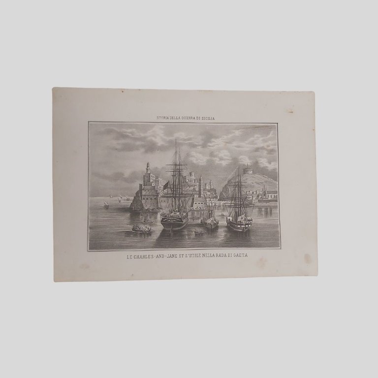 Litografia originale su carta, tratta da Domenico Valente, Storia della guerra di Sicilia, Napoli, 1862. Tavola sciolta, cm 35×25. Naturali tracce d’uso, qualche fioritura, in buone condizioni. Litografia originale raffigurante le due Navi le Charles and Jane e l’Utile che con circa 960 volontari al comando del generale Giacomo Medici, partite come avanguardia della spedizione dei mille nella notte tra l’8 ed il 9 giugno 1860, furono intercettate dalla pirofregata borbonica La Fulminante e condotte priogioniere nella rada di Gaeta. Si tratta di una stampa originale dell’epoca, non di una riproduzione moderna, destinata in origine alla consultazione e alla divulgazione storica, oggi apprezzata come documento collezionistico e iconografico.Esemplare di sicuro interesse per collezionisti di Risorgimento italiano, storia militare, iconografia ottocentesca e per studiosi del processo di unificazione nazionale.